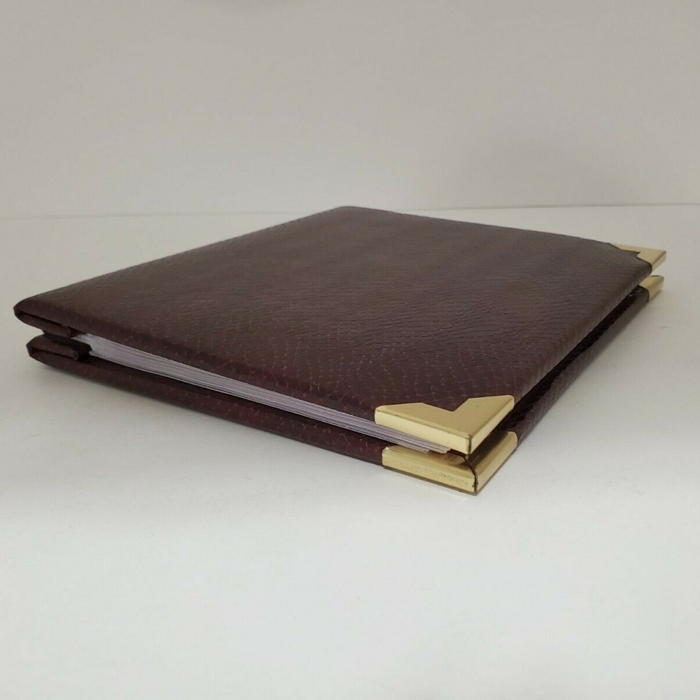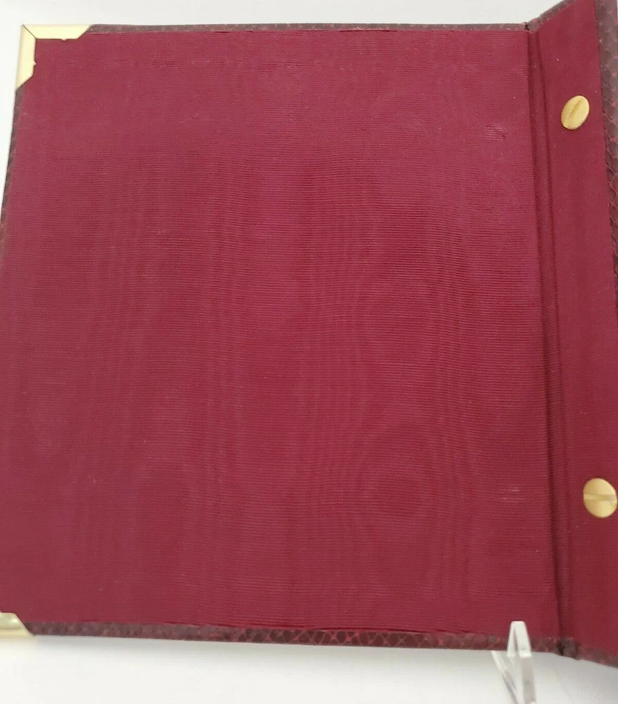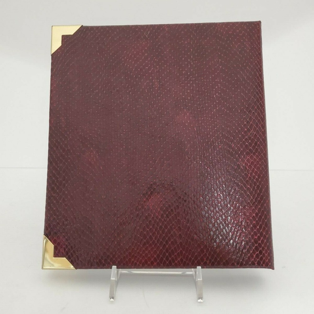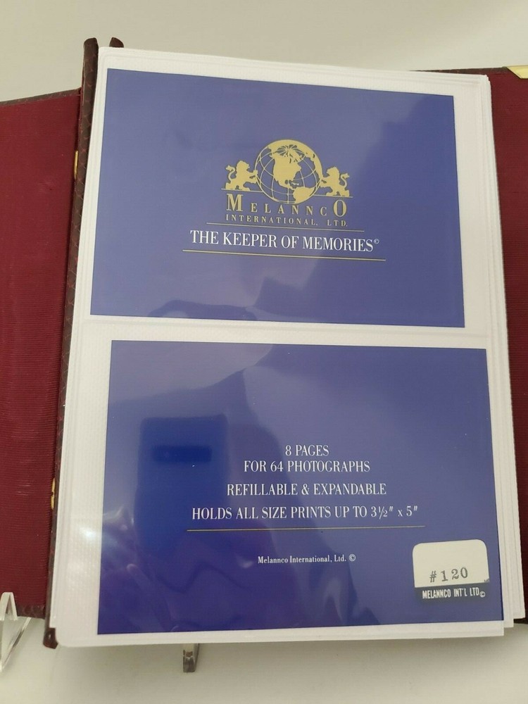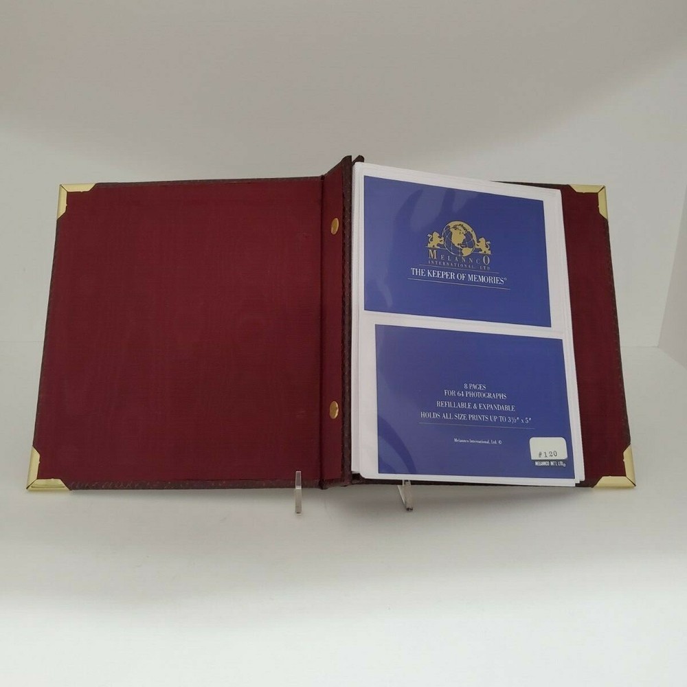 Display those memories! We take so many photos with our cameras, so print your best and display them in this beautiful photo album! This is a never-used, new photo album by Melannco International. Covered on the outside with maroon textured leather or vegan leather, the inner cover is lined with maroon watered taffeta fabric. The corners are protected from wear by brass corner trim, matched to the brass-colored posts. The album includes 8 slip-in photo pages that hold a total of 64 photos, 3 1/2" x 5". Additional pages can be added to expand the capacity of the album. Condition is "New". Shipped with USPS.