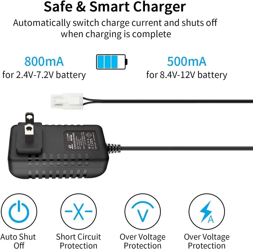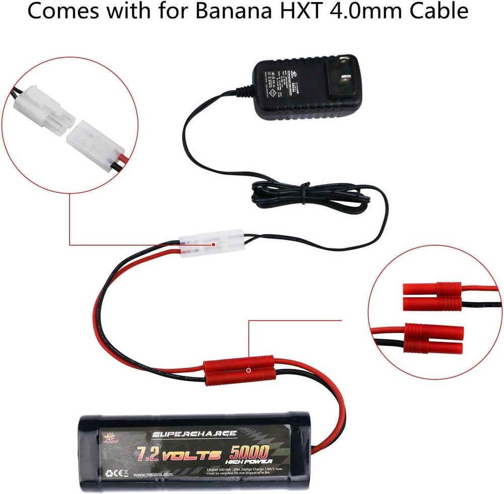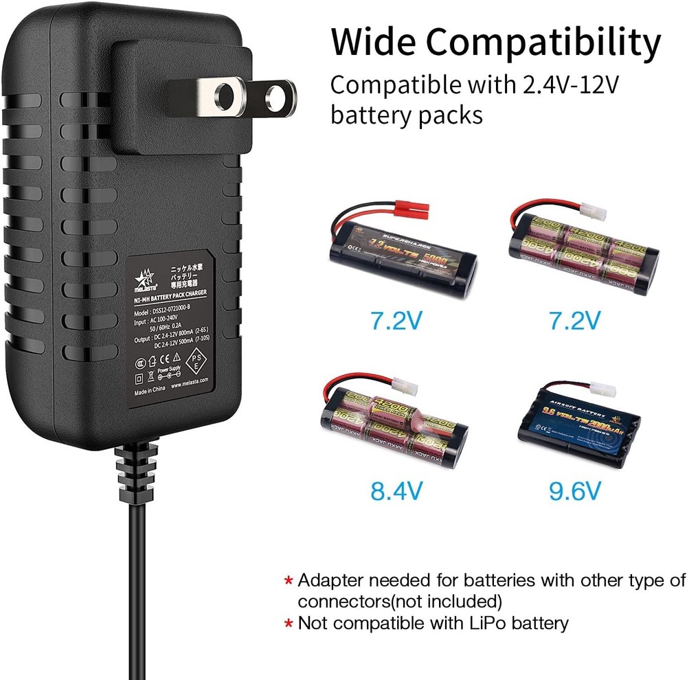 Melasta 7.2V 9.6V 8.4V RC Car Battery Charger Compatible with Green,Red Description: Features: 2 in 1 RC Battery Charger: The Melasta RC charger has a standard Compatible with tamiya connector that fits most NiMH RC batteries and it comes with an extra for HXT 4.0mm banana plug for Redcat Hexfly NiMH batteries. Universally charges Ni-MH or Ni-CD battery packs of 2.4V-12V voltage. Charger with male tamiya plug, tamiya female plug to banana male cable in addition) Smart Trickle Charger: Automatically detects the voltage of your battery and shuts off when battery is fully charged in order to avoid over-charge. Charges at a 800mA for 2.4V-7.2V battery or 500mA for 8.4V-9.6V battery. Typical charging time is 6-10 hours depends on battery capacity Intuitive Charge Indicator: LED light on the charger stays in Red during charging process and turns Green when battery is fully charged. Flashing red indicates that there is a bad connection. Lights off means charger is defective, replace needed Safe & Reliable: Built-in protections guards against over-charge, over-current, short circuit and reverse polarity, protects your battery and extend its’ longevity. NOTE!!! DO NOT charge any Li-ion batteries with this charger SHIPPING: We are always working hard to ensure your package arrives as soon as possible. Please understand that some factors like weather, high postal traffic, and the performance of shipping companies are outside of our control. We offer free shipping to the lower 48 states and ship within 3 business days of payment, usually sooner. We do not accept P.O. Boxes. Please provide a physical address. For shipping outside of the continental USA, we only use eBay's Global Shipping Program. The item is shipped to KY and then sent to the rest of the world. International customers are responsible for all duties and taxes. Continue to check out in order to calculate costs for shipping the item to your country. Messages regarding eBay's Global Shipping Program MUST be directed at eBay EXCLUSIVELY. PAYMENT: We accept payment by PayPal only (Can accept all kind of credit cards). Please pay as soon as possible after winning an auction, as that will allow us to post your item to you sooner. Payment must be received within 3 business days of auction closing. Before buying, please make sure your PayPal and eBay address is correct. If not, please correct it before payment. We have confidence in our products, but if you are not fully satisfied please contact us within 30 days of purchase and you will get full refund of your money. Return the product in the same condition you received it. Please note - return shipping will be paid by the buyer.