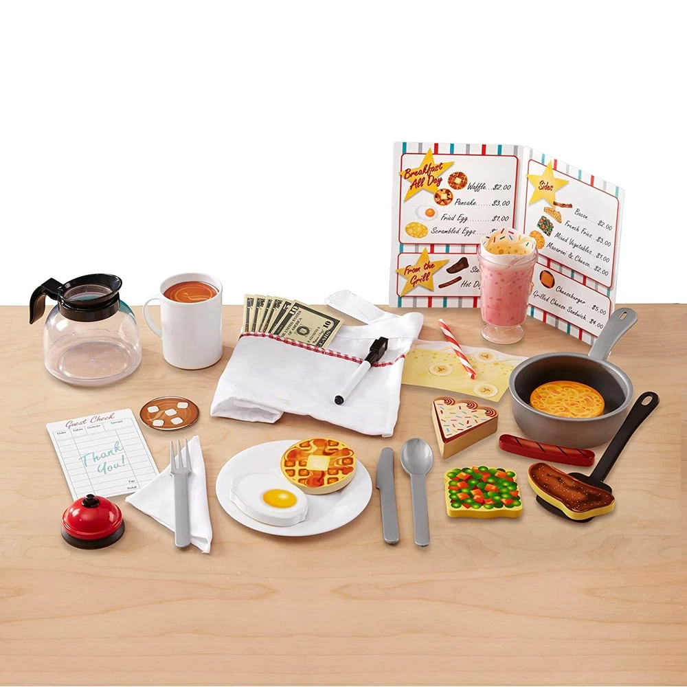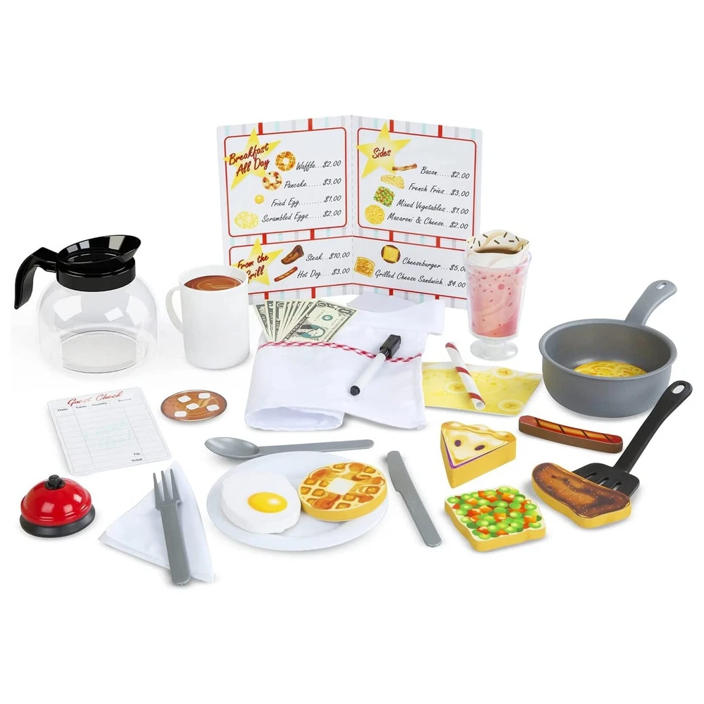 Serve up Playtime Favorites. Youngsters will have fun pretending to order, cook and serve diner classics with this play food and accessory set. From coffee and milkshakes to breakfast and dessert, there is a lot for children to do with this 41-piece set. Includes 7 double-sided wooden food pieces, working bell, menu, play money, guest check with dry-erase marker, milkshake cup with inserts, straw, coffee pot, coffee mug with inserts, apron with pockets, frying pan, spatula, fabric napkin, plate, fork, knife, and spoon. 41-piece set. Ages 3 and up. China. Visit Our Store Contact Us Melissa & Doug Star Diner Restaurant Play Set (41 pcs) Serve up Playtime Favorites. Youngsters will have fun pretending to order, cook and serve diner classics with this play food and accessory set. From coffee and milkshakes to breakfast and dessert, there is a lot for children to do with this 41-piece set. Includes 7 double-sided wooden food pieces, working bell, menu, play money, guest check with dry-erase marker, milkshake cup with inserts, straw, coffee pot, coffee mug with inserts, apron with pockets, frying pan, spatula, fabric napkin, plate, fork, knife, and spoon 41-piece set Ages 3 and up China