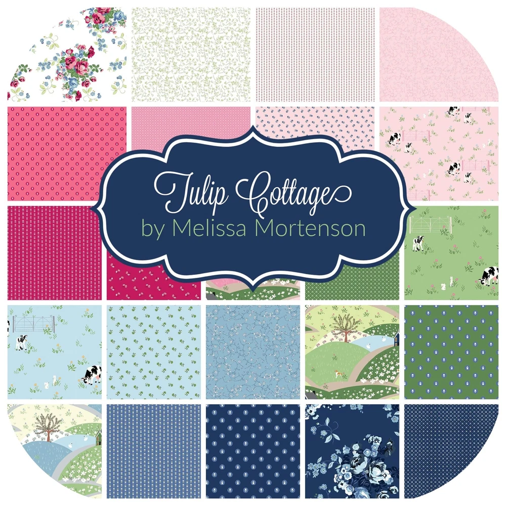 Fabric bundle of 24 18-inch by 22-inch fat quarters from the Tulip Cottage collection by designer Melissa Mortenson for . My husband used to live in the Netherlands, and we've been lucky enough to visit several times in recent years. On our last trip, we were riding the train thru the Dutch countryside when I looked out the window and saw the most idyllic farm. A bright white farmhouse with green shutters and roof and a speckling of black and white cows grazing in the pasture. With that beautiful farm in my mind, I began sketching this fabric collection. Along with the farm, I drew inspiration from our collection of antique Delft tiles and, of course, the famous Dutch Tulip fields. I also threw in a few personal touches, such as my husband's vintage Land Rover, our family dog, and cows from my in-law's farm here in Kentucky. Tulip Cottage collection from Designed by Melissa Mortenson Fat Quarter Bundle includes 24 18-inch by 22-inch fat quarters 100% Cotton; premium quilt shop quality fabric