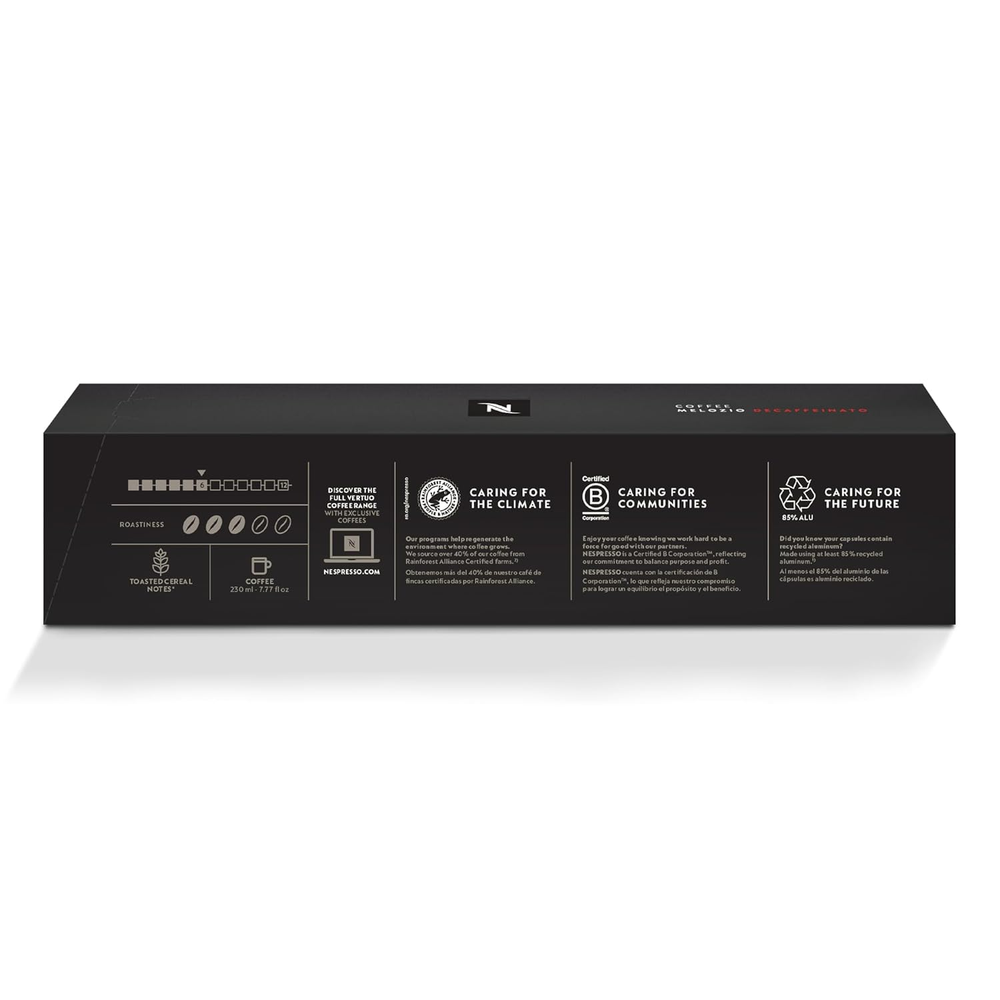 SMOOTH ; BALANCED:;Melozio Decaffeinato delights with its classic cereal note, honeyed sweetness and smoothness. MEDIUM ROAST: We split roast this Vertuo coffee pod’s Arabica coffees. It allows the Brazilian Bourbon to develop its cereal note to become a sweet and smooth coffee. Lightly roasting the other Arabica beans rounds out Melozio.; Intensity 6 MELOZIO DECAFFEINATO COFFEE BREWS 7.77 FL. OZ.: These Nespresso Vertuo pods provide you with a 7.77 fl. oz. serving of coffee which is perfect for a longer drinking experience SAVOR WITH MILK: This coffee with milk opens up the softer, sweeter side;of this coffee, enhancing the biscuity notes. SUSTAINABILITY FIRST:;As a certified B Corporation,;Nespresso;meets the highest standards of verified social and environmental performance, joining a global movement using business as a force for good.;;Nespresso aluminum capsules are fully recyclable and guarantee coffee freshness – we provide different options for recycling your used aluminum coffee pods to fulfill our collective commitment to protecting the environment. MACHINE COMPATIBILITY:;Nespresso;Vertuo pods are not compatible with;Original;Line machines.;; A HARMONIOUS BLEND of Latin American Arabicas just like Melozio, but decaffeinated – and carrying the same aroma of delight. This decaf Vertuo still sings with smooth cereal notes and a honeyed sweetness.