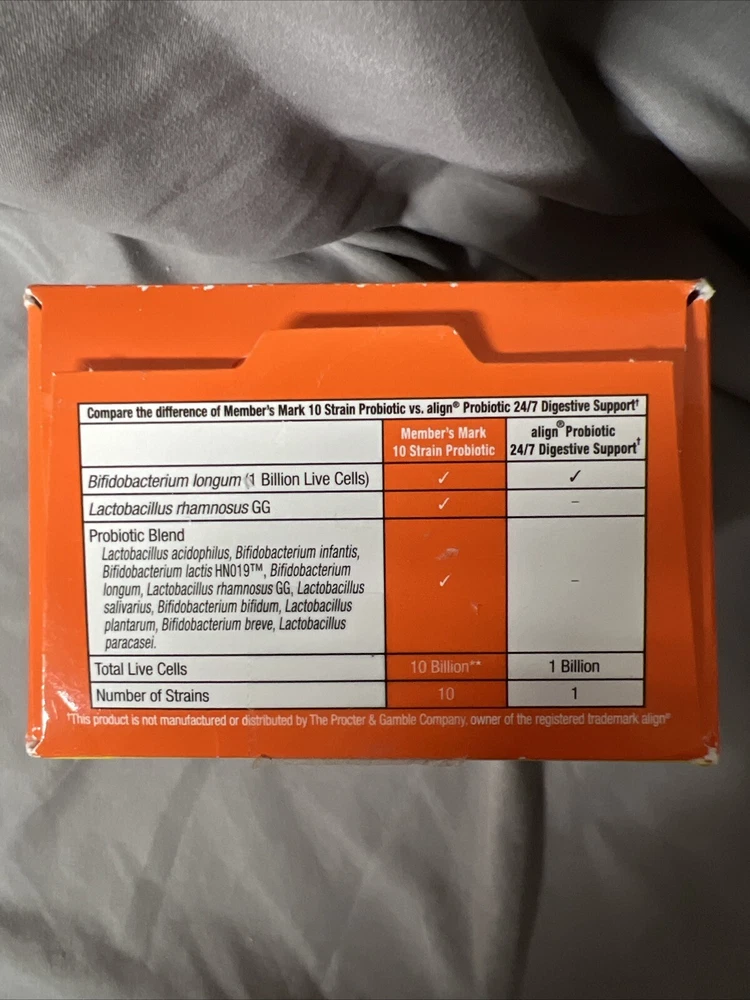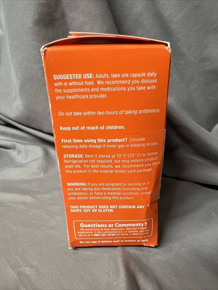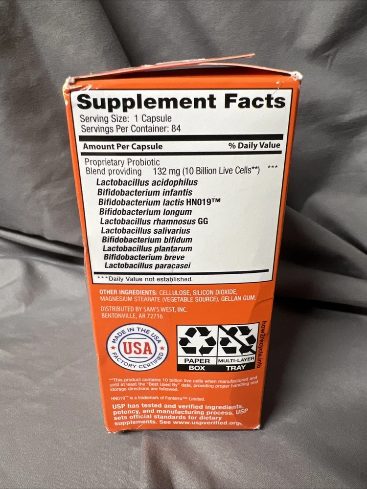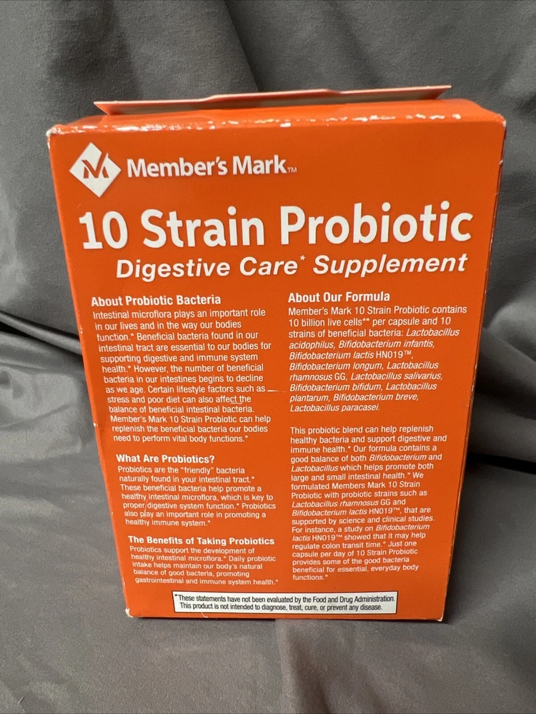 Item Weight: 4 oz Type: Vitamin Active Ingredients: Probiotic, Lactobacillus plantarum, Lactobacillus paracasei, Bifidobacterium infantis, Bifidobacterium breve, Bifidobacterium longum, Lactobacillus acidophilus, Lactococcus Lactis, Bifidobacterium bifidum, Lactobacillus salivarius gtin13: 0193968027261 Style: NUTRITIONAL_SUPPLEMENT MPN: 101273 Features: Dairy-Free, Gluten-Free, Soy-Free, Alcohol Free, Caffeine-Free, All Natural Expiration Date: 04/2025 Formulation: Capsule Number of Pills: 84 Flavor: Neutral Brand: Member's Mark When to Take: After Meal UPC: 0193968027261 Main Purpose: Immune Support, Boxing, Anti-Aging, Digestive Support Ingredients: Probiotic, Bifidobacterium infantis, Acidophilus, Bifidobacterium bifidum, Caffeine