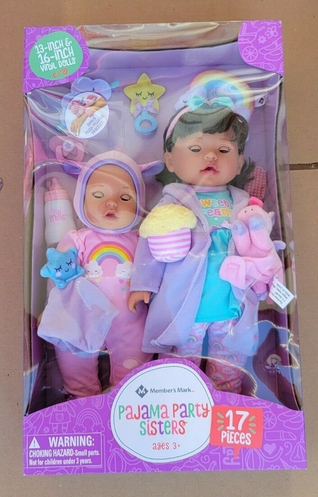 Members Mark Sweet Sisters Vinyl Doll Set 13" & 16" Pajama Party Brown Eyes Girl (eyes open and close when tilting up or laying down)