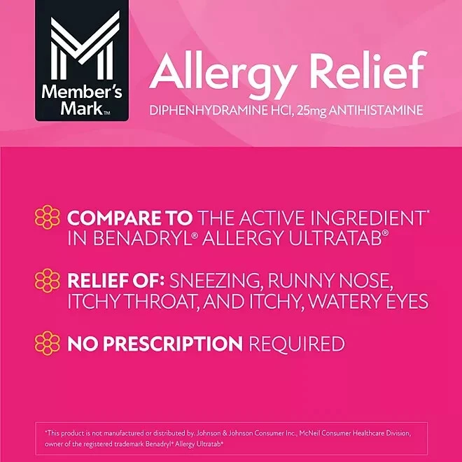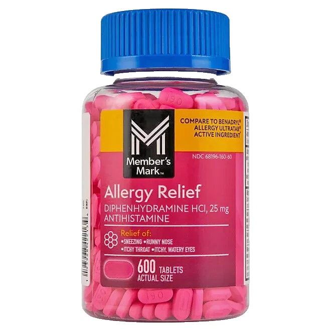 Member’s Mark Aller-Ben Allergy Medication 25mg, 600 Tablets – Antihistamine, Allergy Relief, Diphenhydramine, Compare to Benadryl – Fast Shipping Get the same relief as Benadryl with Member’s Mark Aller-Ben Allergy Medication. This 25mg diphenhydramine antihistamine provides fast-acting relief from allergy symptoms such as sneezing, runny nose, and itchy eyes. With a generous 600 tablets, it’s a cost-effective solution for year-round allergy management. Ideal for treating seasonal allergies, cold symptoms, and more. Key Features: 600 Tablets : Long-lasting supply for continuous relief. 25mg Diphenhydramine : The same active ingredient as Benadryl. Antihistamine : Helps relieve allergy and cold symptoms quickly. Fast Shipping : Get your allergy relief delivered right to your door. Compare to Benadryl : Same trusted formula at a fraction of the price. Effective for sneezing , itchy eyes , runny nose , and nasal congestion . Choose Member’s Mark Aller-Ben for affordable, fast-acting allergy relief with free shipping !