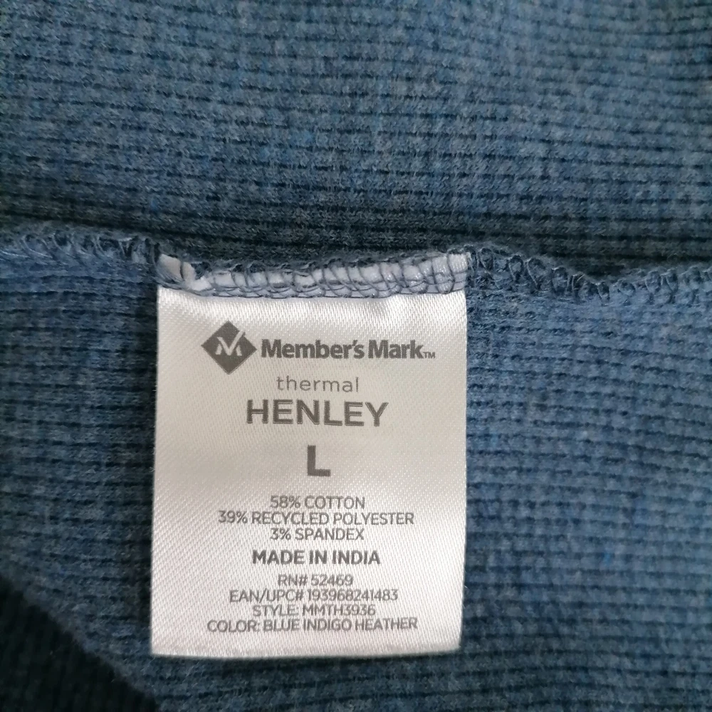 gtin13: Dose Not Apply Neckline: Henley Accents: Button Color: Blue Country/Region of Manufacture: India Season: Fall, Spring, Summer, Winter Sleeve Length: Long Sleeve Handmade: No UPC: Dose Not Apply Pattern: Solid Fabric Type: Knit Personalize: No Material: Cotton, Polyester, Spandex Size: L Department: Men Seller Notes: “Pre-Owned In Good Condition.” Vintage: No Brand: Member's Mark Fit: Regular Features: All Seasons, Easy Care, Stretch, Thermal Theme: Classic Garment Care: Machine Washable Type: T-Shirt Size Type: Regular