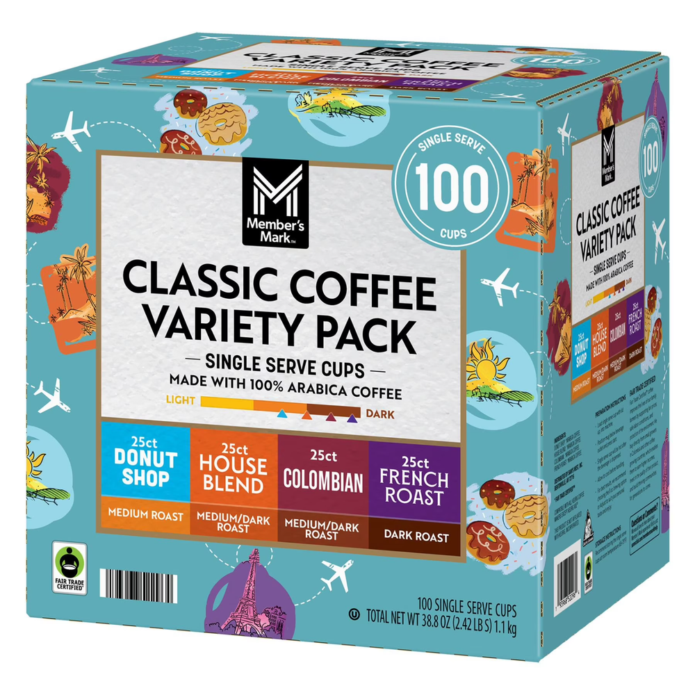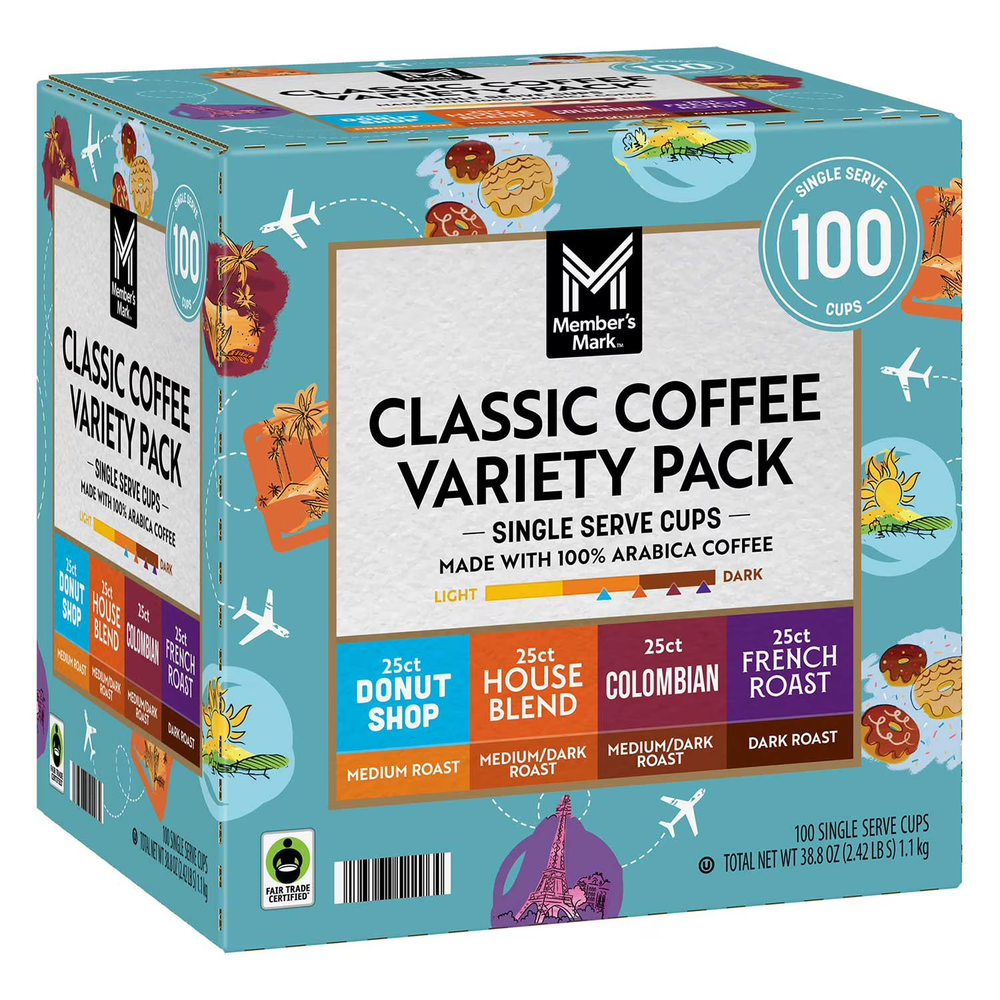 Member's Mark Classic Coffee Pods, Variety Pack, 100 ct. About this item Product details Experience Classic Coffeehouse Flavors at Home Bring the charm of a coffeehouse to your kitchen with this classic collection. Perfect for busy mornings, relaxed weekend brunches, or those moments when you want to indulge in something special, this assortment is crafted to elevate your coffee experience. Delightful Assortment of Flavors Discover a variety of rich and satisfying flavors: Member's Mark™ French Roast: Bold and full-bodied with notes of dark chocolate, roasted nuts, and a hint of caramelized sugar. Member's Mark™ House Blend: Smooth and balanced, featuring toasted nuts, mild cocoa, and a touch of vanilla. Member's Mark™ Donut Shop: Flavorful and well-balanced with caramel, browned sugar, and a hint of sweet citrus. Member's Mark™ Fair Trade Organic Dark Roast: Rich and robust with dark chocolate, spicy-sweet baking spices, and bittersweet cocoa notes. Perfect for Any Occasion Whether you're hosting friends, enjoying family gatherings, or savoring a quiet moment, this variety pack caters to every coffee lover's taste. Treat yourself or share the joy with others—there’s something for everyone in this collection.