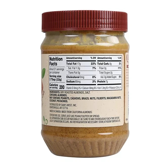 Made with just two ingredients, Member’s Mark™ Almond Butter (24 oz.) is a delicious spread to have in the pantry. It’s a great alternative to peanut butter for those who have an allergy or just for a change of pace. Always Healthy and Delicious Simple and delicious, Member's Mark Almond Butter is made with just two ingredients: almonds and salt. Our almond butter is non-GMO and gluten-free, and it contains no artificial flavors or preservatives. Spread Member's Mark Almond Butter on toast, waffles or sandwiches, or enjoy it as a wholesome dip. Almond Butter Basics Almond butter is a nut butter spread. This particular 24-ounce jar is only made with almonds and salt and no extra fillers. Because there are only two ingredients, natural separation will occur. Be sure to keep the oil in the jar and mix it into the almonds before using in order to get the full flavor. If there are any peanut allergies in the household, almond butter would make a delicious and comparable alternative. Uses for Almond Butter Member’s Mark Almond Butter tastes great on its own. Savor a spoonful on its own as a snack or when you want to amp up your protein intake. Each serving contains seven grams of protein. For lunch or small meals, spread it onto bread with jelly for a classic combination. Dip celery sticks into it for a healthy and crunchy treat. It can also be used in cold noodles with "peanut" sauce, in cookie batter, or mixed into oatmeal for a cozy and hot bowl of food.