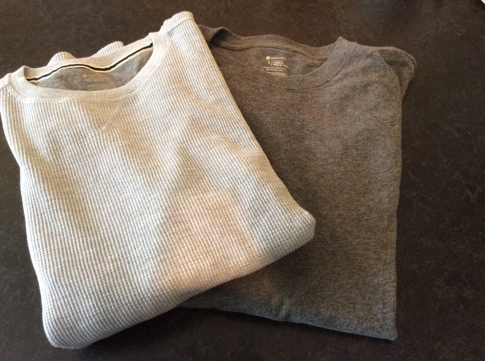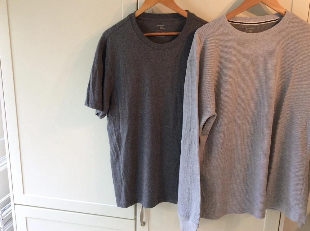 Members Mark Crew Neck Tee thermal Bundle Large Grey Short Sleeve Used. 12 pictures showing all measurements Please note the size pictures We recommend any item is cleaned before use TWO ITEM BUNDLE, ONE POSTAGE COST. HOW MUCH NEW ?