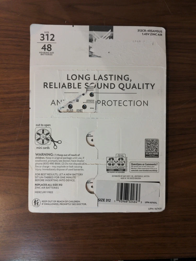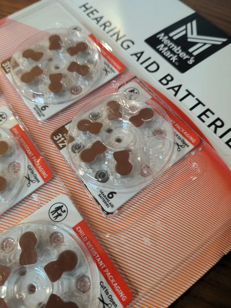 Members mark hearing aid batteries. 48 pack - one is missing for a total of 47 pcs. Brand new 312 size for hearing aids with child resistant packaging.