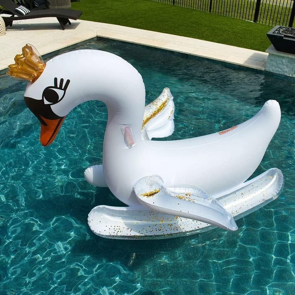Members Mark Inflatable Ride On Pool Float Swan Over 4Ft Side Handles Weight Limit 200lbs. Brand New. When the temperatures the Member's Mark Ride On Float is an ideal choice for water enthusiasts looking for fun and relaxation. This novelty pool float is made of heavy gauge PVC, so it's designed to last. And, when you're ready to float, you'll love the speedy inflation. The float deflates quickly as well, so you can easily dry it and store it when it's not in use. Plus, there's a quick release safety valve. The float has side handles for stability and a weight limit of 200lbs.This float combines practicality with fun, making it a perfect addition to any pool or beach outing. Features: Inflated Dimensions: 63 in x 52 in x 47 in Impressive Size : Measuring over 4 feet in length, this float offers ample space for comfortable lounging and riding Side Handles : Equipped with sturdy side handles, it provides added stability and ease of use, making it easier to climb on and off Quick Release Valve : The quick release valve allows for rapid inflation and deflation, ensuring a hassle-free setup and storage process Weight Capacity : With a weight capacity of up to 200 pounds, it accommodates a wide range of users, ensuring safety and durability Repair Patch : Included with the float is a repair patch, providing a simple solution for any minor punctures or leaks, thereby extending the float’s lifespan Shipping Policy: Free shipping to the 48 contiguous states only We ship out the day after payment or the same day if possible