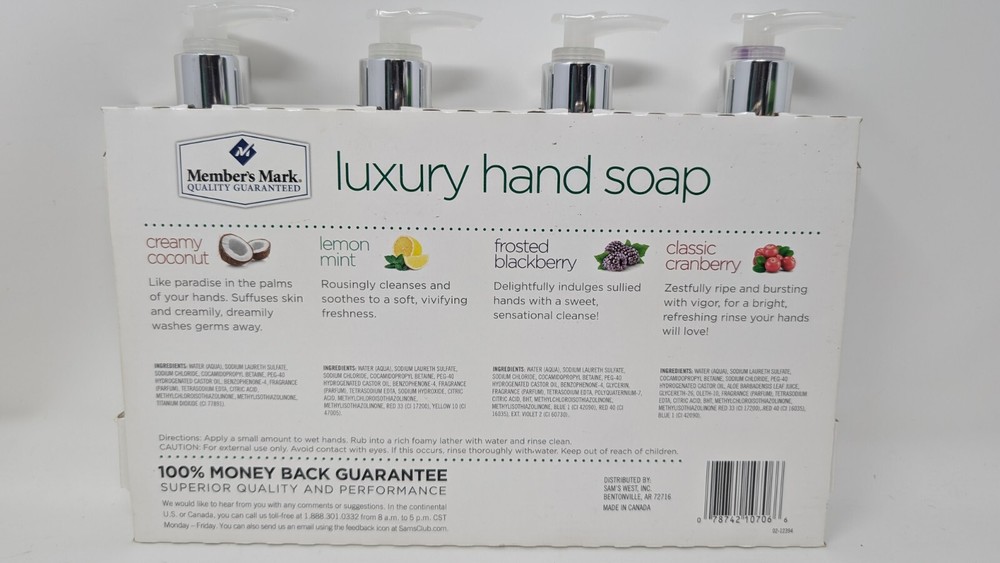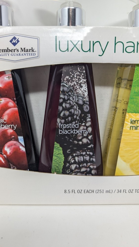 Try out this luxury Hand soap variety pack from Member's Mark. All soaps are brand new never used. Each bottle 8.5 fl oz or 251 mL. Fragrances include: Classic Cranberry, Frosted Blackberry, Lemon Mint, and Creamy Coconut. If you have any questions, just ask. Thank you for looking.