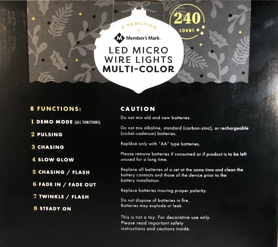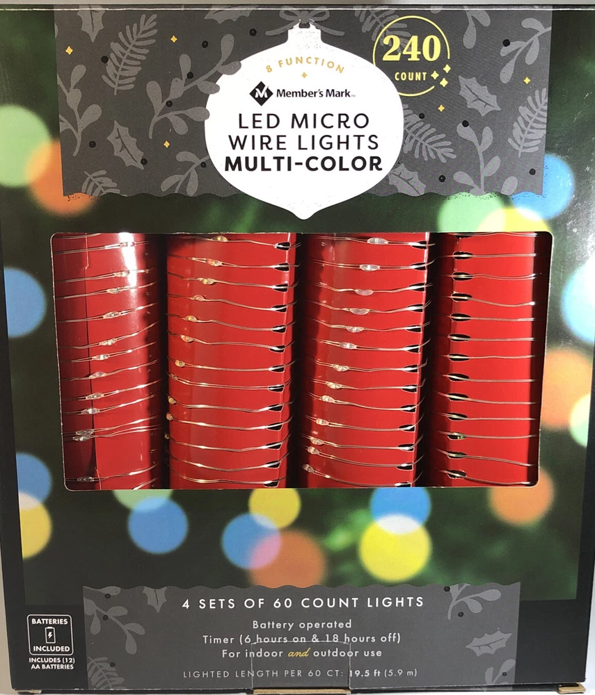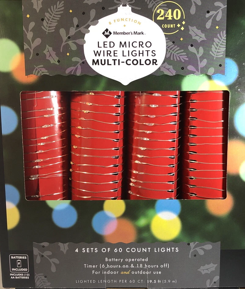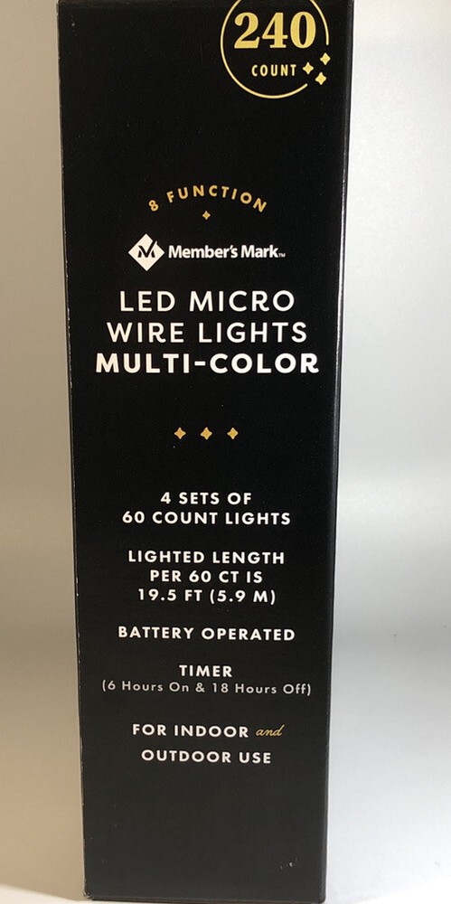 Members Mark Micro LED Wired Lights 240 Count 8 Function! 12 AA Batteries Included!. Condition is Brand New. Brand: Members Mark Model: 240ct Micro LED Wired Lights Shipped with USPS Priority Mail . You Will Receive 1 ea Members Mark Micro LED Wired Lights 240 Count 8 Function! 12 AA Batteries Included!. RARE VINTAGE COLLECTIBLE SHIPS N 24 HOURS Packed By Our Award Winning Packaging And Shipping Department Long Time E-commerce Seller For Over 20 Years LIMITED AVAILABILITY Follow Our EBay Store For All New Rare Products Posted Daily and Specials Please click https://www.ebay.com/usr/boughtnowcommerce Inventory Box Number: Timer function: 6 hours on, 18 hours off 8 unique functions to create your own light show Indoor/outdoor use Add some festive fun to your interior or exterior decorations with these LED Multifunction Wire Lights. Complete with timer function and eight unique settings, these lights are sure to give your winter wonderland variety all season long. Specifications Light count: 240 ct. (4 sets of 60 each=240 ct.). Light length: 78' Total length: 82' 12" x 4" silver copper wire. Includes (12) AA batteries