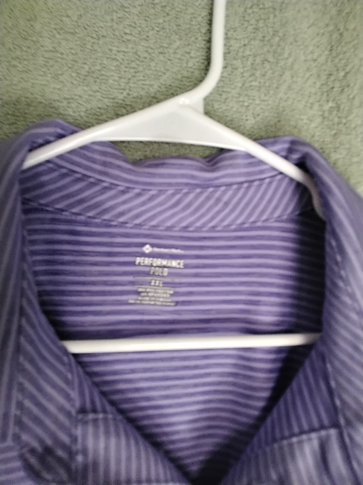 Members Mark Performance Moisture Wicking Mens Polo shirt Solid purple Color with striped pattern Size XXL Polyester Spandex button closure length 33" arm pit to pit 24.5" neck to shoulder 10" pre-owned in great condition Check out the store for More great findings on Tops, Skirts & activewear. Gigos Wow Deals | eBay Stores