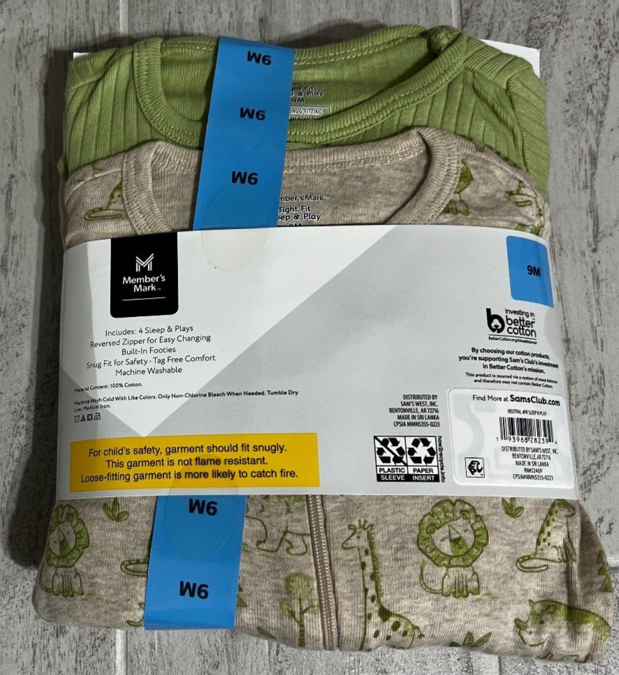 BX-4-1292 Keep your little one cozy and comfortable with this 4-pack of Member's Mark sleep and play footies. Made from 100% cotton, these one-piece sleepwear outfits are perfect for winter, fall, and spring. The long-sleeved design and zip closure provide extra warmth and convenience, while the multicolor accents and footie details add a touch of fun. Ideal for both baby boys and girls aged 9 months, this set is a must-have for any parent looking for safe and stylish sleepwear options.