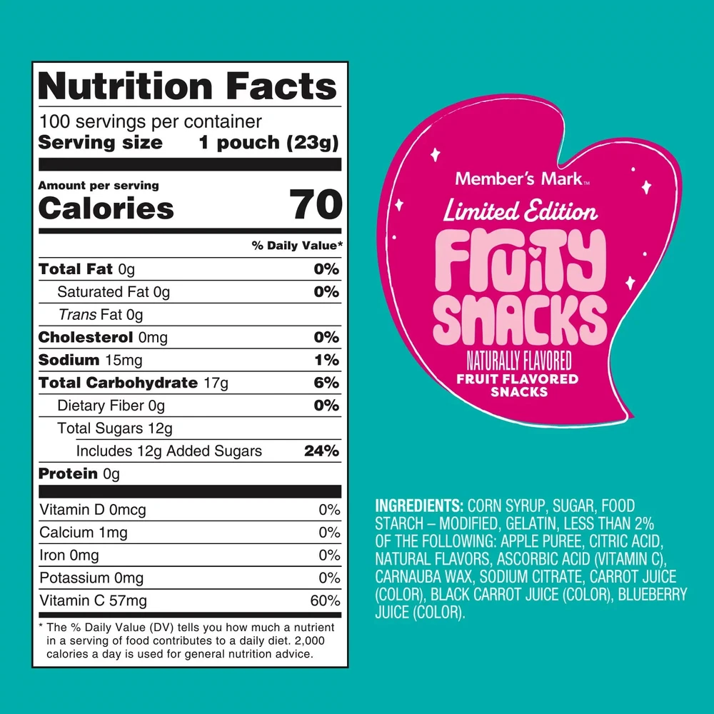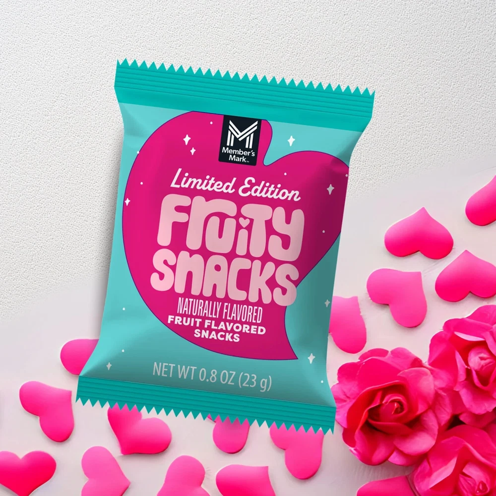 Member's Mark Valentine's Day Fruity Snacks 0.8 oz., 100 pk. Product Details 100 - 0.8 oz. pouches Flavors: Strawberry, Raspberry, and Grape No artificial colors or flavors Naturally flavored Gluten free Description the festive spirit with Member's Mark Valentine's Day Snacks Variety Pack. This pack is a delightful treat your whole family will enjoy. Each box contains 100 individually wrapped pouches of Valentine's Day snacks, offering a variety of flavors and vibrant Valentine's Day shapes. Flavors include Raspberry (red), Strawberry (pink), and Grape (purple). Portable and Versatile Snacking Option These individually wrapped holiday snacks are perfect for on-the-go snacking. They're great for popping in lunch boxes, taking in the car, or packing for your next trip. But the versatility doesn't stop there. Member’s Mark Fruity Snacks can also be incorporated into your favorite at-home dessert or snack. Add them as a topping on cakes or cupcakes, sprinkle on your favorite frozen treat, or even use as an element on a homemade dessert pizza for an extra element of fun. Quality Ingredients and Nutritional Value These Valentine's Day Snacks not only taste great, but they also offer nutritional value. They exude a mild, fruity aroma and have a soft and chewy texture that's sure to please. They're an excellent source of vitamin C, and are gluten-free and naturally fat-free. This means you can feel good about the snacks you're sharing with your family.
