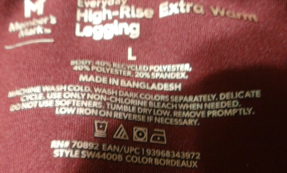 Seller Notes: “No rips or stains.” Fabric Wash: Dark Accents: Cut Out, Logo Vintage: No Type: Leggings Style: Ankle Size: L Product Line: Evereyday Features: Breathable, Comfort, Compression, Convertible, Easy Care, Footless, Insulated, Lightweight, Media Pocket, Pockets, Shaping, Slimming, Stretch Personalize: No Pattern: Solid Brand: Member's Mark Fabric Type: Blended Fabric Performance/Activity: Basketball, Climbing, Cross Training, Cycling, Dance, Driving, Fishing, Football, Gym & Training, Hiking, Pilates, Racing, Riding, Running & Jogging, School, Track & Field, Typing, Walking, Yoga Color: Red Rise: High (Greater than 10.5 in) Occasion: Activewear, Casual, Travel, Workwear Material: Polyester, Spandex Handmade: No Character: Members Mark Garment Care: Machine Washable Department: Women Model: Members Mark Theme: Modern Inseam: 28 in Season: Fall, Spring, Summer, Winter Waist Size: 30 in Country/Region of Manufacture: Bangladesh Size Type: Regular