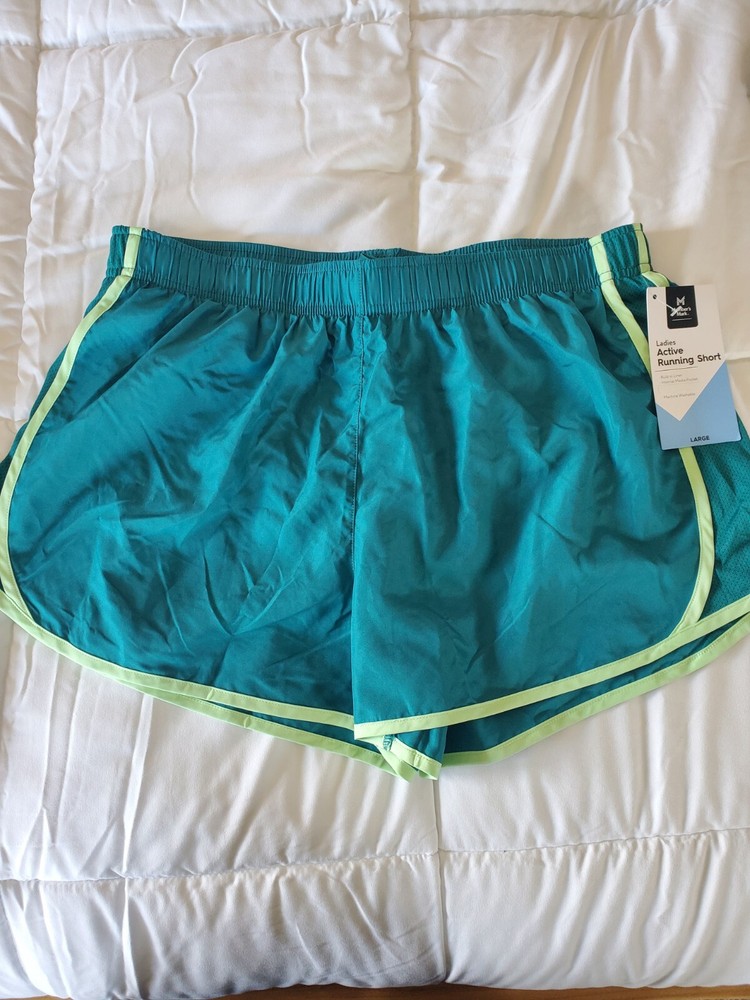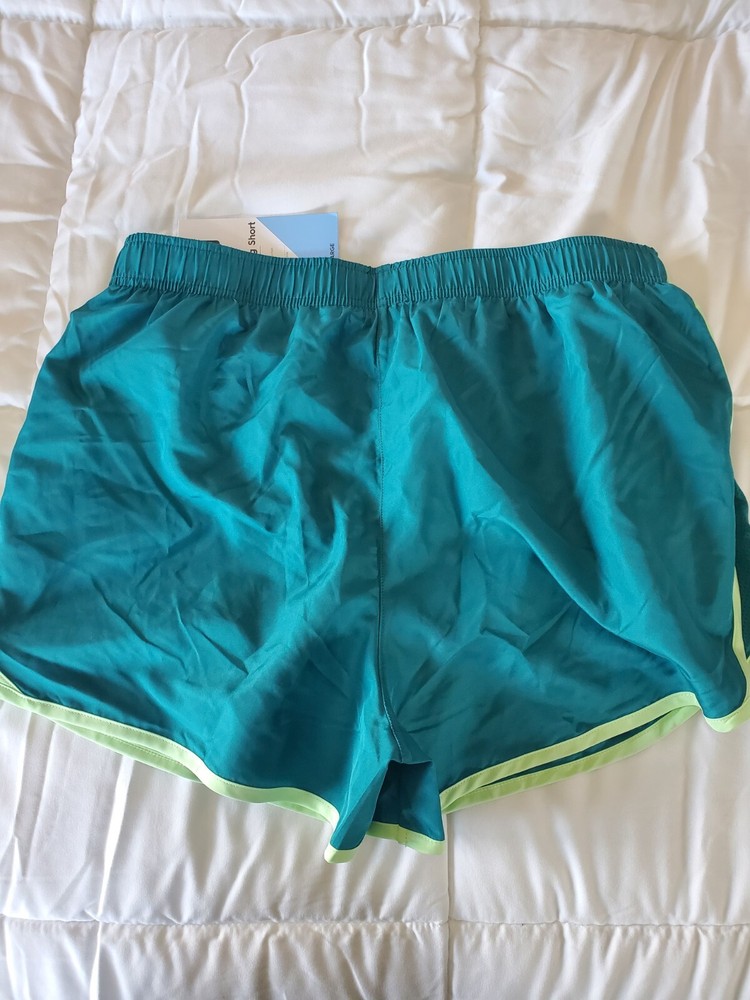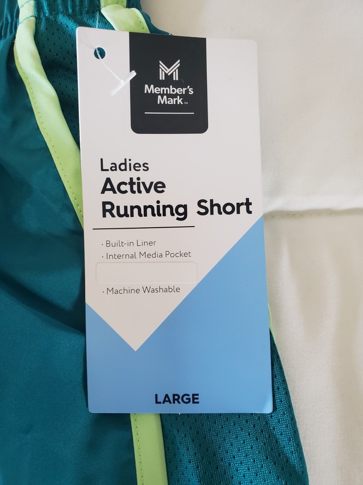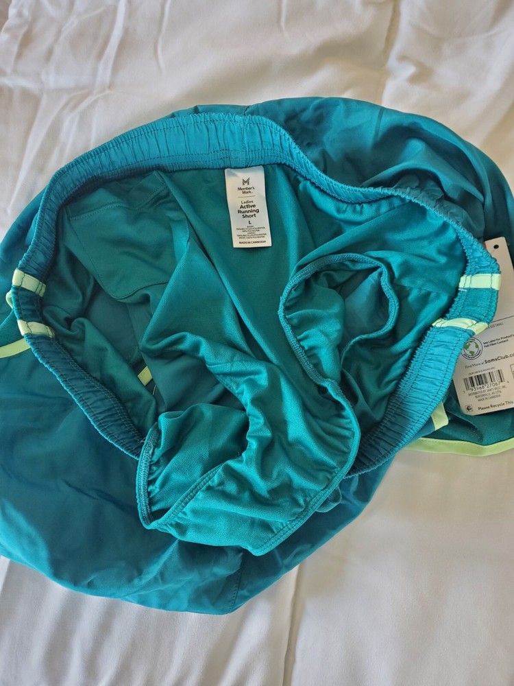 This product is a pair of new green athletic running shorts for women, made of a polyester blend material. They are branded as Member's Mark and are size L, with an athletic fit and style. The shorts are suitable for activewear occasions and come with tags still attached. One small pocket inside the waist band and also has a built in internal support layer - like underwear. Never worn. Please message me with any questions regarding the product. Please take responsibility to read, understand and ask questions before committing to purchase item(s).