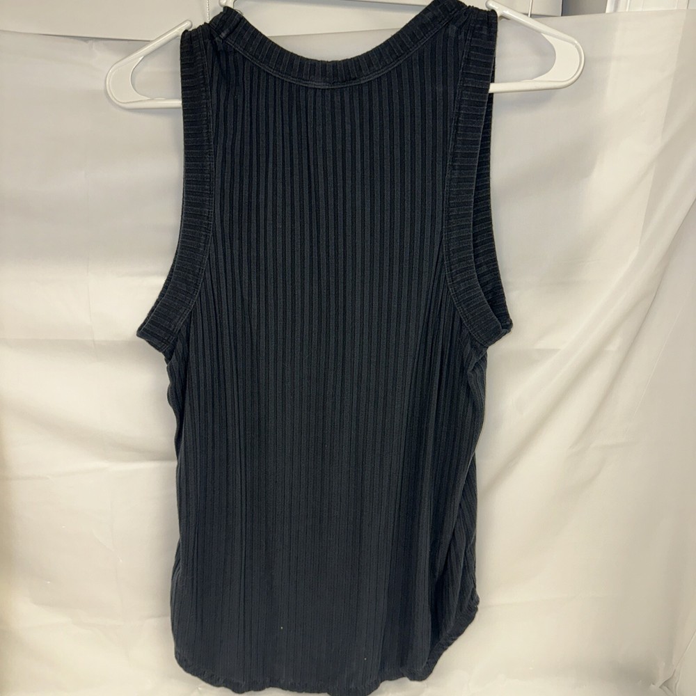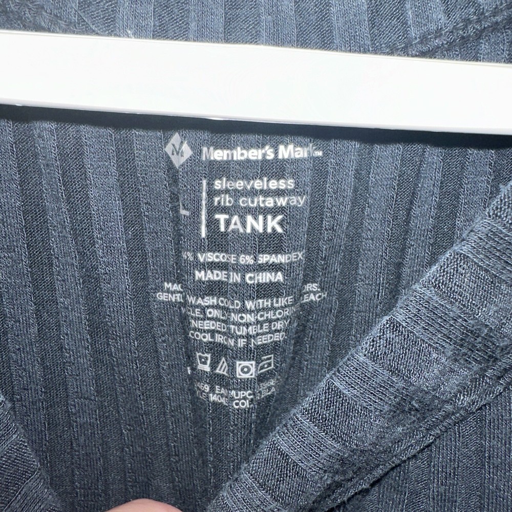 This is a pre-owned navy blue sleeveless tank top for women from the brand Member's Mark. It is a size L and has a round neckline with a rib cutaway design. The material is a blend of spandex and viscose. The style is basic and it is a regular size type. Pit to pit 19inches but stretches more Top to bottom length 26inches