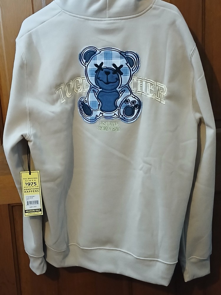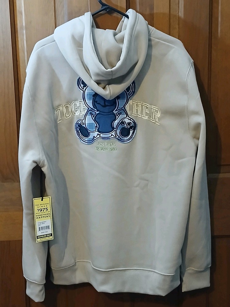 Members only beige Hoody Mens Medium New with Tags Blue plaid bear sewn on with embroidered Together This is brand new with tags 100% Polyester Very soft pullover hoodie with kangaroo hand pocket Any questions please message me