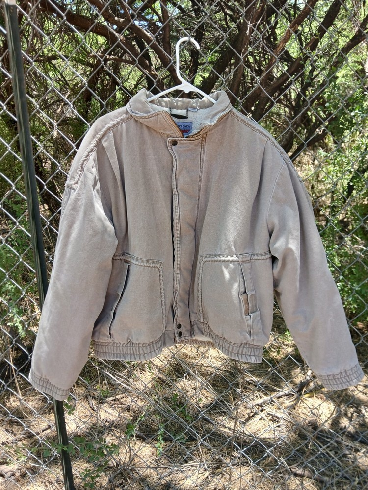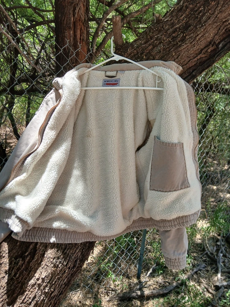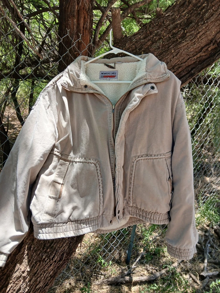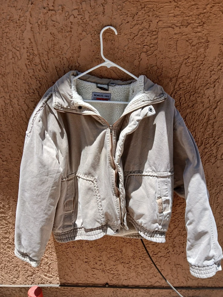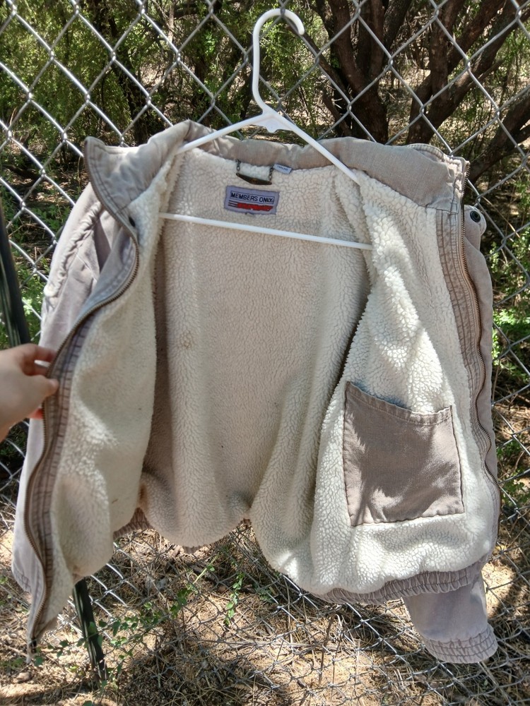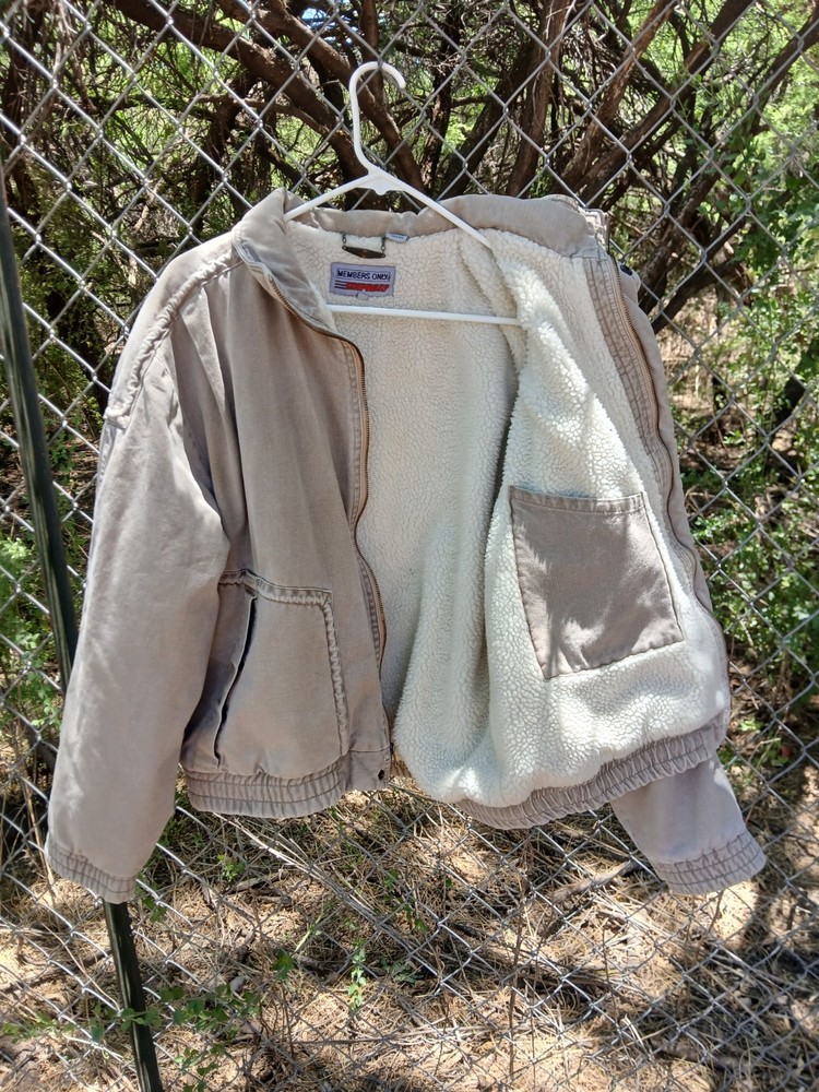 Members Only Beige Jacket Size Men's Large. A nice heavy coat perfect for keeping warm and stylish during the colder months. Small stain on the inside, otherwise in great condition. It doesn't say the materials on the tag, but the outer material feels like soft denim and the inside is soft and fuzzy.
