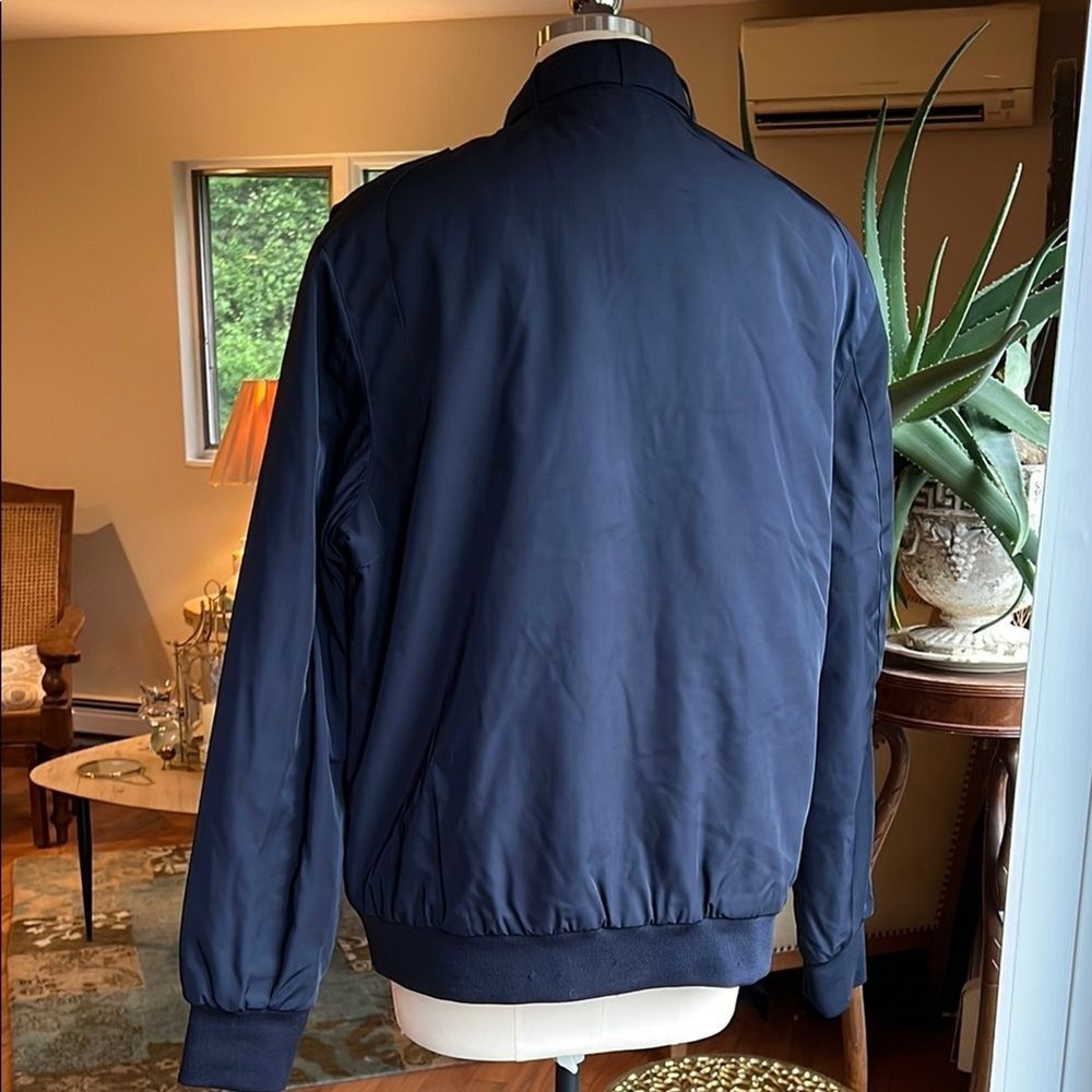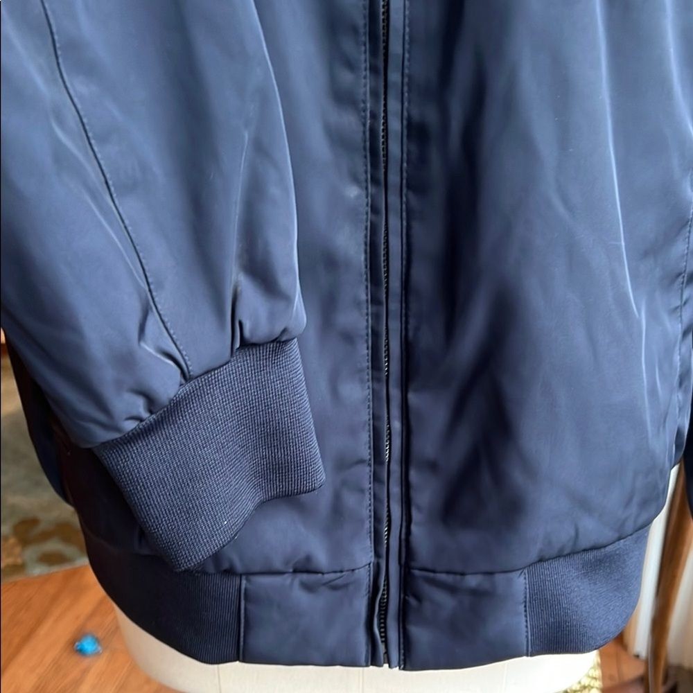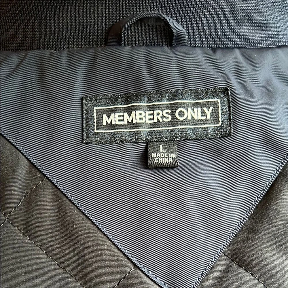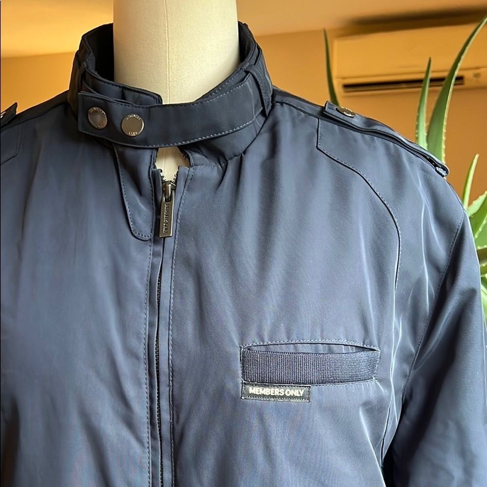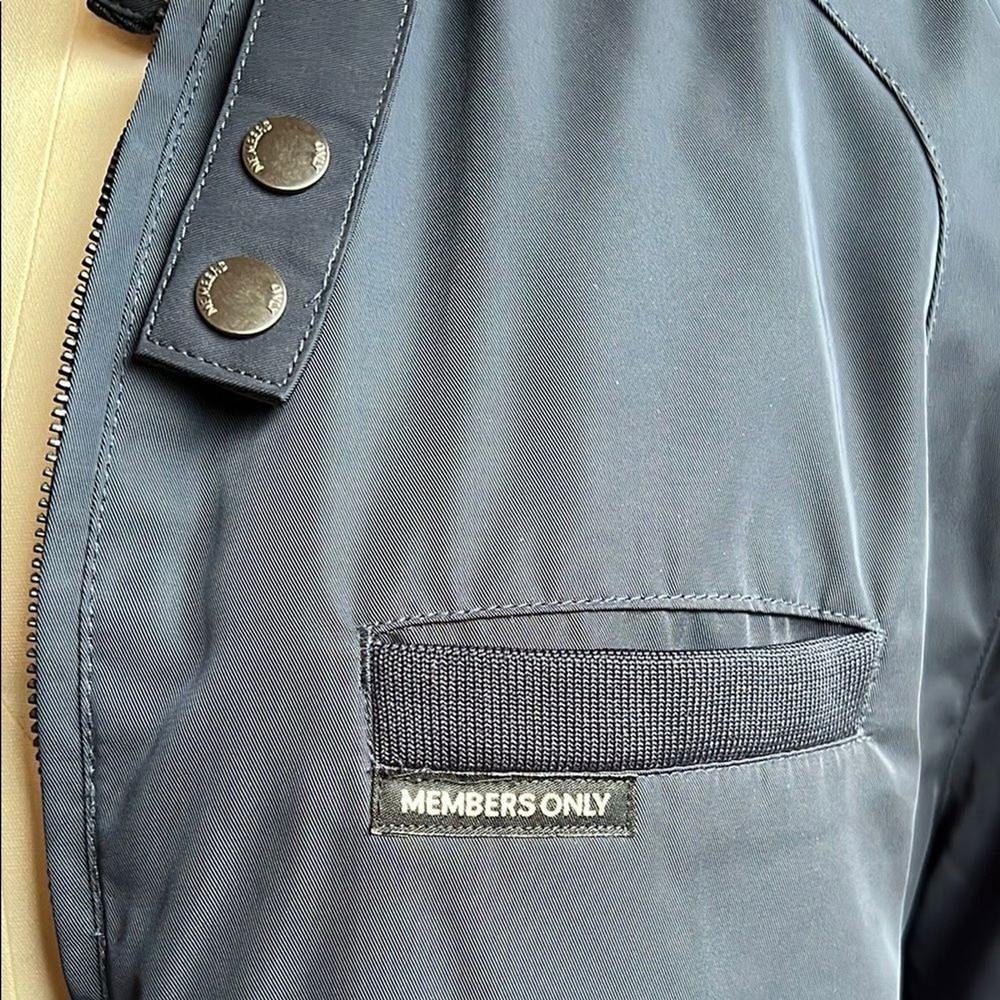 This Members Only bomber jacket in a timeless blue shade showcases a sleek design with a stand-up collar and ribbed cuffs. Its regular fit and smooth finish make it an ideal choice for casual, everyday wear. Quilted interior. Excellent condition!