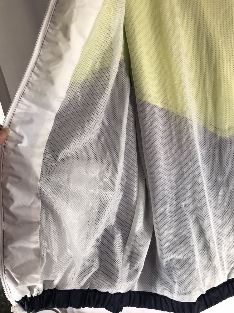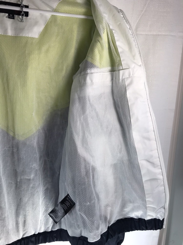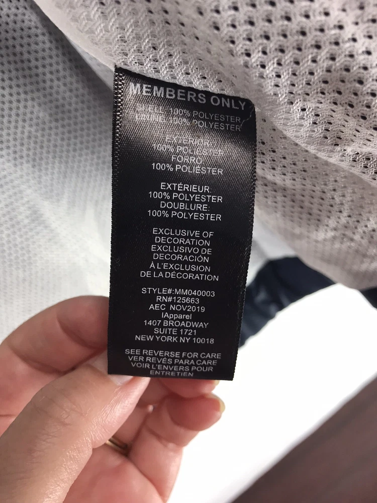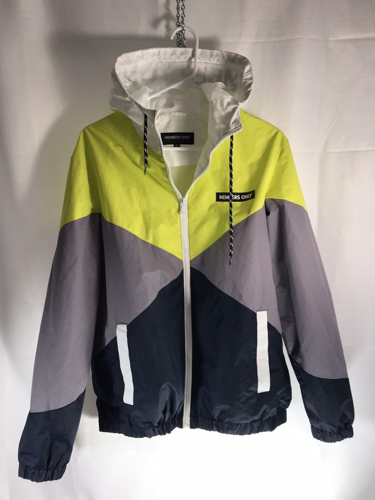 Accents: Pockets (3), Hood Lining Material: Polyester Closure: Zip Brand: Members Only Style: Windbreaker Department: Unisex Adults Theme: Colorful Outer Shell Material: Polyester Pattern: Geometric Fabric Type: Polyester Insulation Material: Polyester Occasion: Casual, Party/Cocktail, Travel Vintage: No Color: Neon Yellow Navy Blue & White Features: Full Zip Type: Jacket Size Type: Regular Size: M Country/Region of Manufacture: Unknown Season: Fall, Spring, Summer