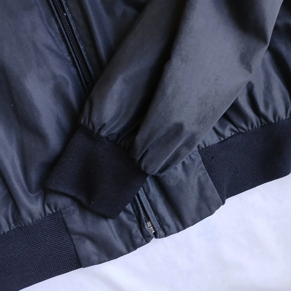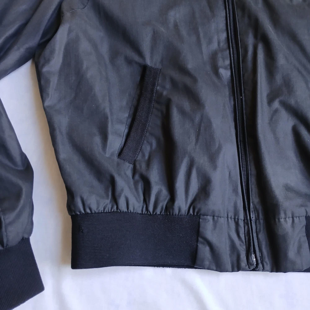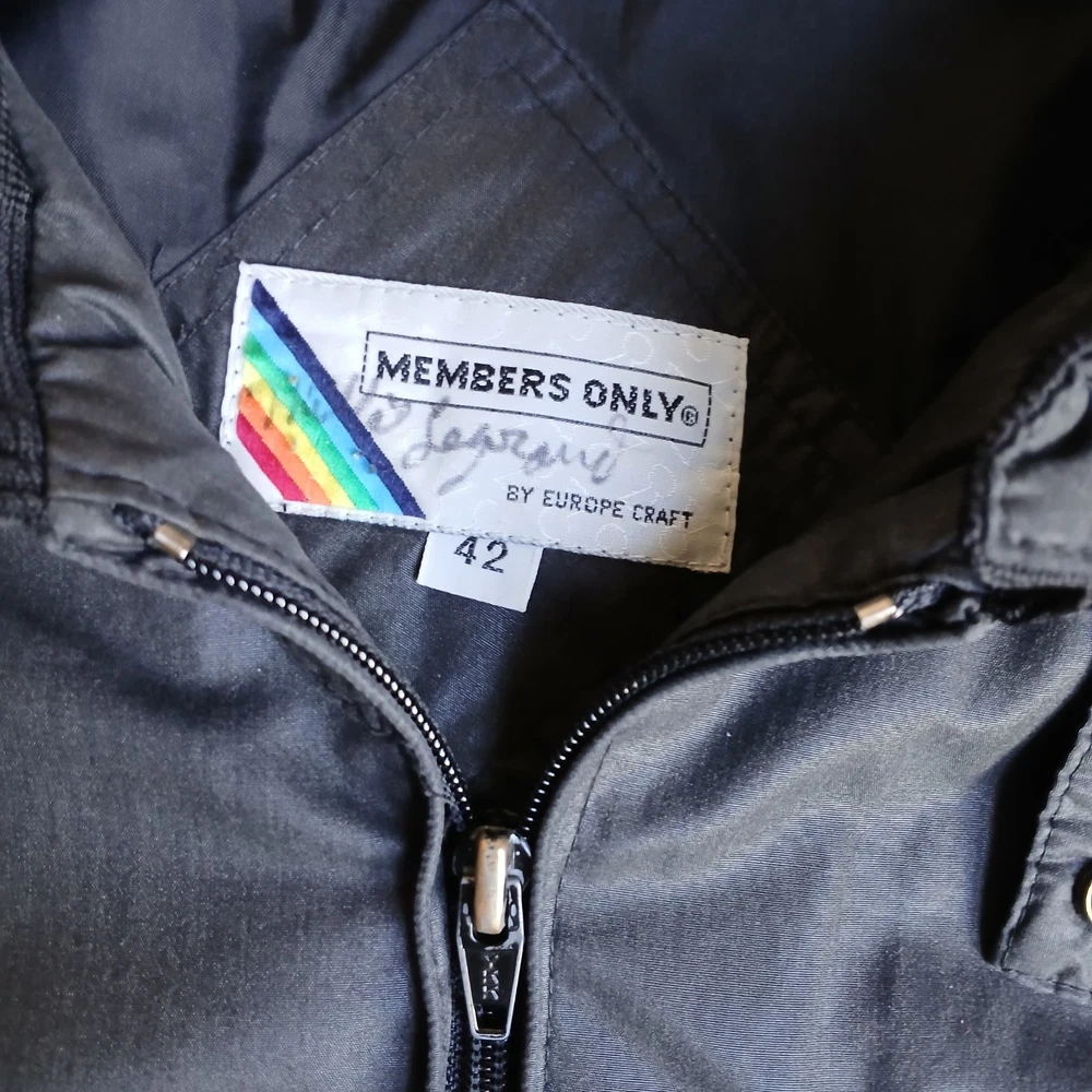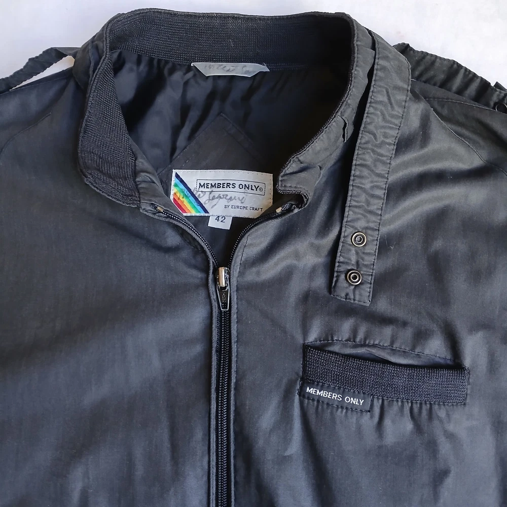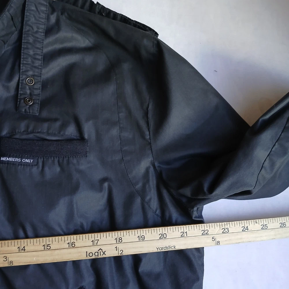 90s Members Only Black Bomber jacket. Full zip front with chin strap Cuffs and hem are ribbed knit. Please refer to measurements to ensure a good fit. Good pre owned condition. Has a couple of marks and snag on lower hem.