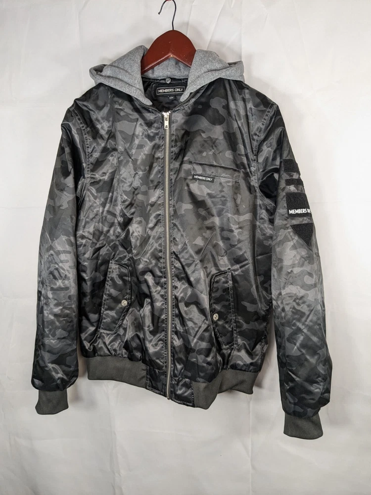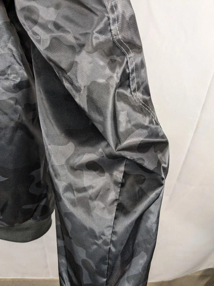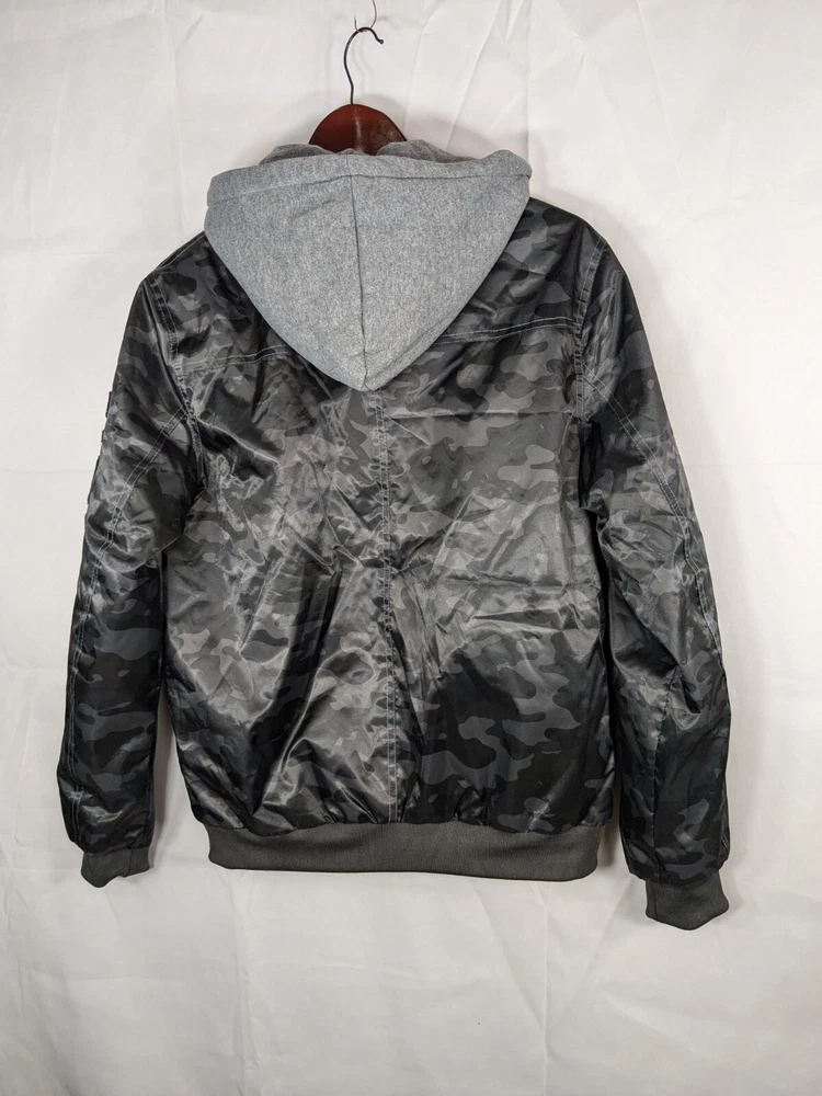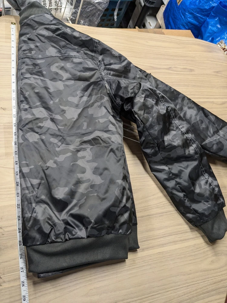 Great pre-owned condition (please see photos) Information • Flaws: No stains or holes. • Style: Grey Black Camo Flight Satin Twill Hooded Jacket Long Sleeve Soft Comfy • Please see photos for measurements in inches. • Material: 100% Polyester • Washing Instructions: Machine Wash • Size: Medium • We are happy to answer your questions! 2 day shipping. Business days are Monday-Friday and exclude weekends and public holidays. All items in my store are purchased second hand. I may miss flaws but I try my best to find everything possibly wrong with it. Thank you for viewing our listing! Have a great day! If you want to negotiate a price, please send an offer.