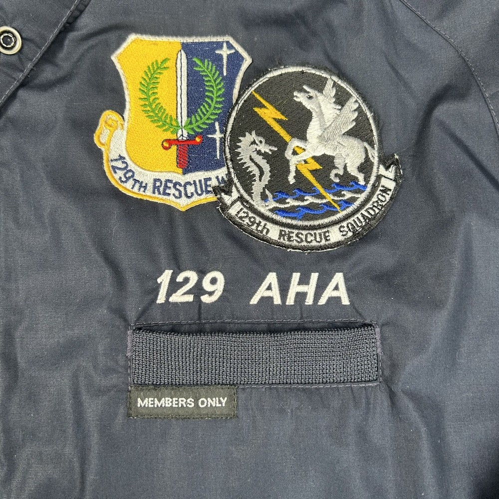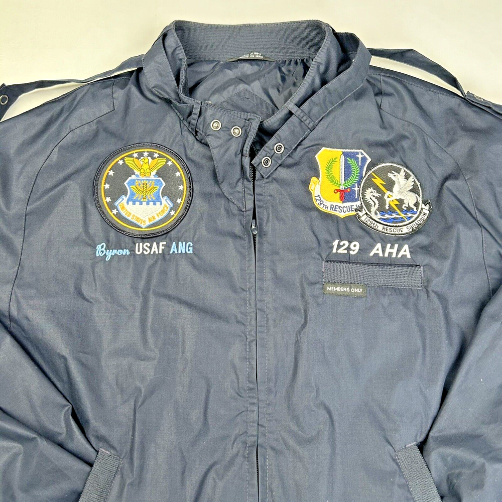 This Members Only jacket is a must-have for any vintage or military style lover. The navy color and solid pattern make it a versatile piece, and the Air Force patches and ANG 129th AHA Rescue Wing patches give it a unique touch. The full zip closure and polyester outer shell material ensure comfort and durability. This jacket is perfect for men who want to add a touch of the 80s and military style to their wardrobe. Our goal at Hooked on Resale is to provide the best buying experience on eBay. PLEASE REVIEW ALL PICTURES, for they are a major part of an item's descriptions. PLEASE READ ALL DETAILS THOROUGHLY-- IT'S YOUR RESPONSIBILITY! We do our best to describe all our listings as accurately as possible. We would never deliberately mislead a customer with our description of an item! We are not experts, and we sometimes leave out pertinent information that we don't realize is important. Please do not buy if you have the expectation that items are "perfect" or "Like New" unless stated. We try to describe major flaws and add plenty of photos so you can use this to judge the condition! If you have specific questions, please ask us prior to buying! **If you feel we have not described an item correctly please contact us to see if we can come to a fair resolution before leaving negative or neutral feedback. We want nothing more than our customers to be happy with their purchase.** International Buyers – Please Note: Import duties, taxes, and charges are not included in the item price or shipping cost. These charges are the buyer's responsibility. Please check with your country's customs office to determine what these additional costs will be prior to bidding or buying. We can’t be responsible for how Customs in your country handles packages!