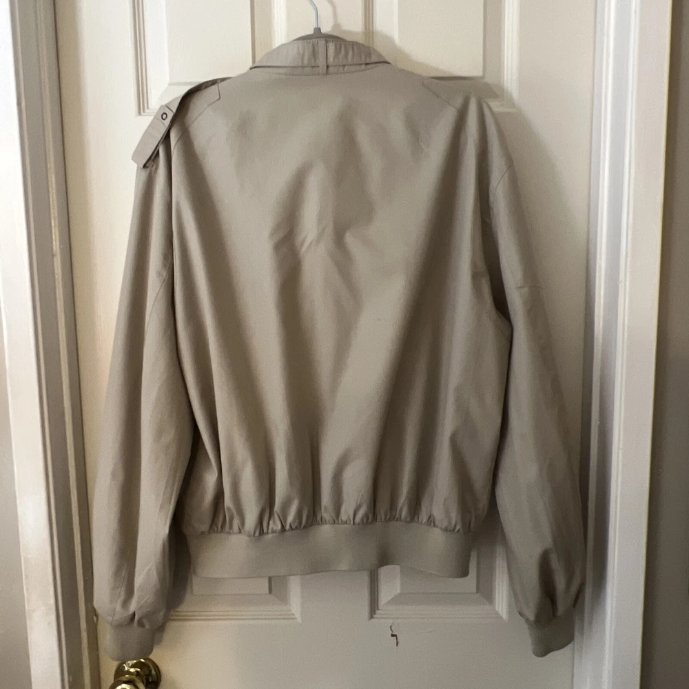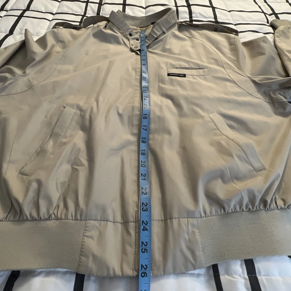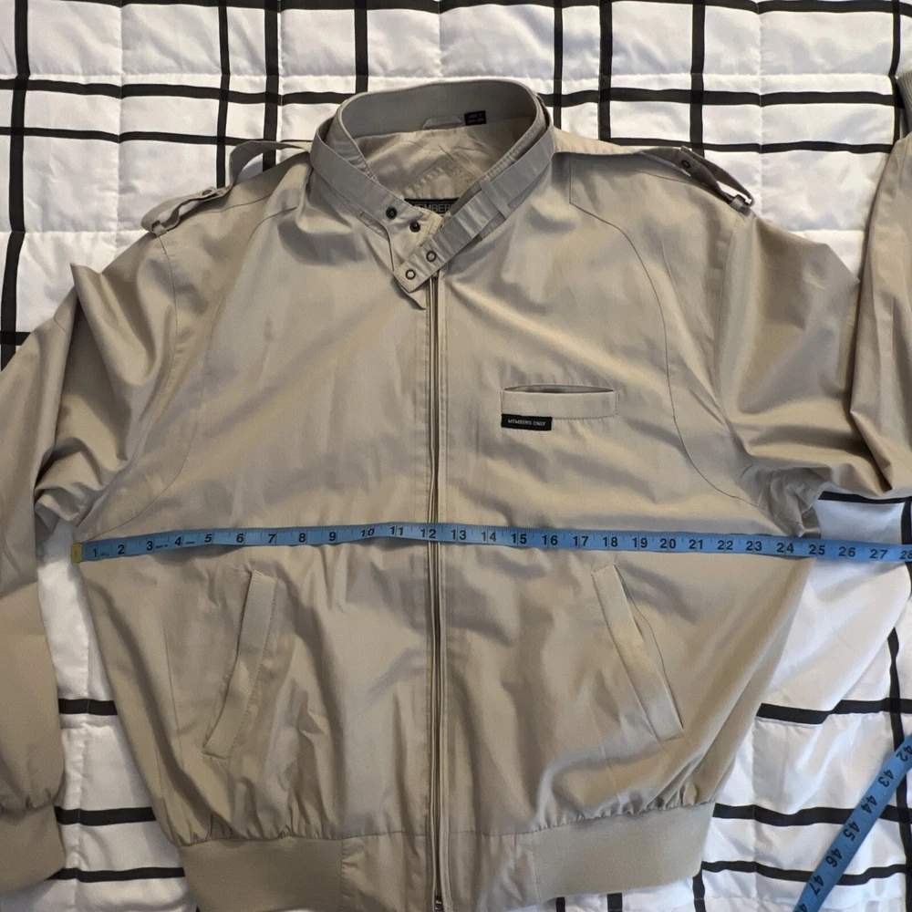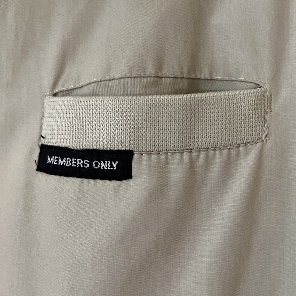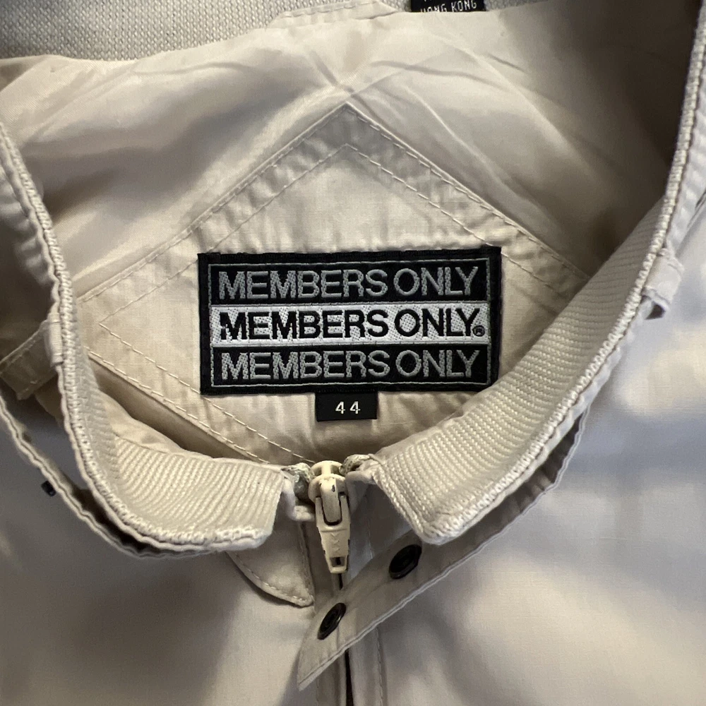 Outer Shell Material: Cotton Blend Features: Full Zip Theme: 80s Vintage: Yes Performance/Activity: Golf Type: Jacket Collar Style: Band Jacket/Coat Length: Short Brand: Members Only Fabric Type: Softshell Fit: Regular Size: 44 Style: Bomber Jacket Accents: Logo Insulation Material: Polyester Size Type: Regular Garment Care: Machine Washable Season: Fall, Spring, Winter Department: Men Country/Region of Manufacture: China Lining Material: Nylon Occasion: Casual, Travel, Workwear Pattern: Solid Color: Beige Closure: Zip Personalize: No Handmade: No