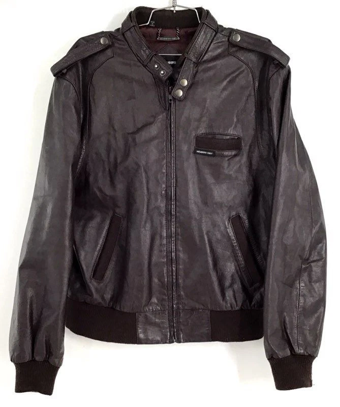 Fit: Regular Size: 44 Type: Jacket Collar Style: Band Country/Region of Manufacture: Korea, Republic of gtin13: Does Not Apply Seller Notes: “In Good Condition” Size Type: Regular Outer Shell Material: Leather Brand: Members Only Features: Full Zip Theme: Outdoor Department: Men Style: Bomber Jacket Occasion: Casual Closure: Zip Lining Material: Nylon Blend Jacket/Coat Length: Short Season: Winter Color: Brown Pattern: Solid UPC: Does Not Apply
