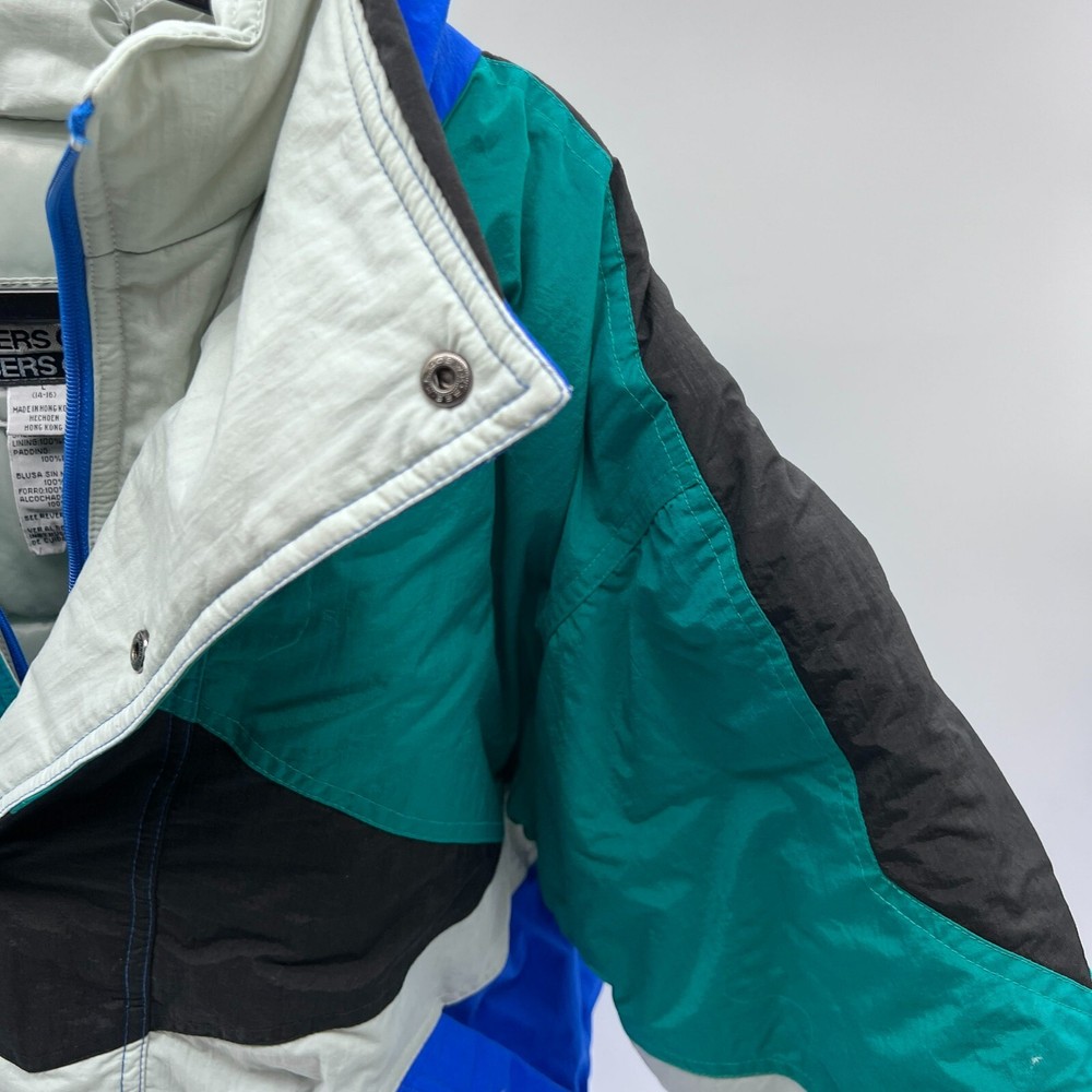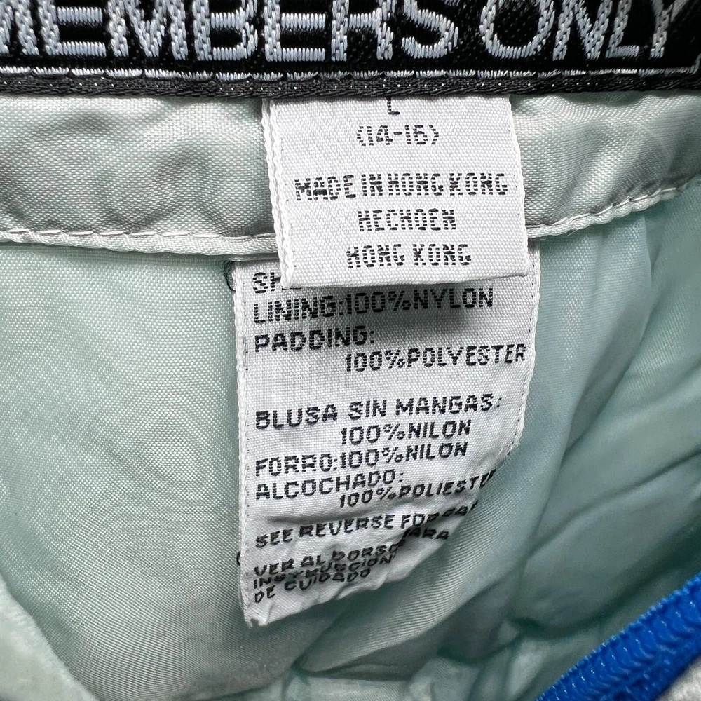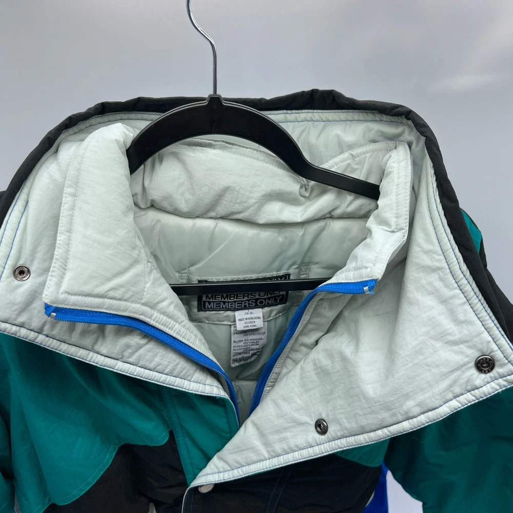 This is a Men's Members Only ski jacket in size L with a multicolor striped design. The jacket is made of nylon with a long sleeve length and features a full zip closure. It has a stand-up collar and a regular fit, suitable for everyday wear. The puffer style jacket is lined with nylon and made of canvas fabric, providing warmth and comfort. Perfect for outdoor activities or casual outings, this jacket offers a stylish and functional addition to any wardrobe. Members Only Mens L Multicolor Ski Jacket Striped Nylon Long Sleeve Full Zip Pit: 21 inLength: 23 inSleeve: 21 in