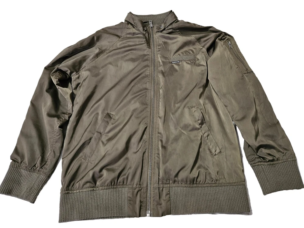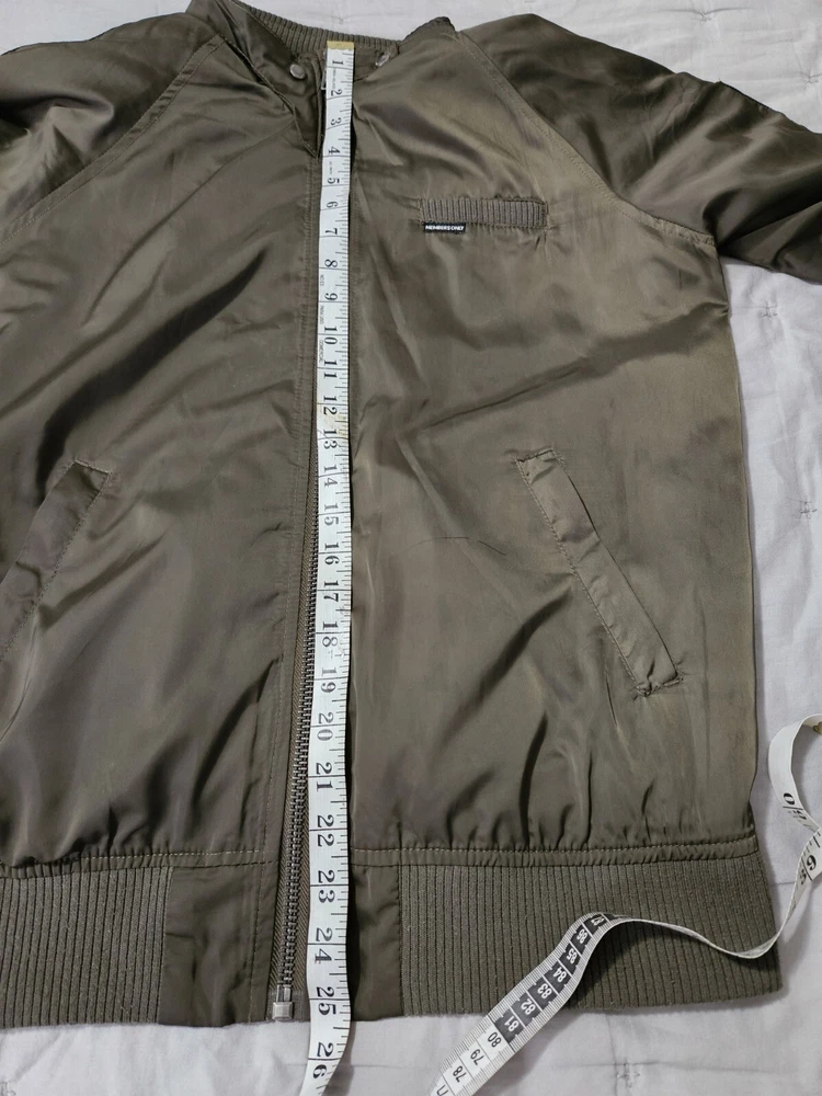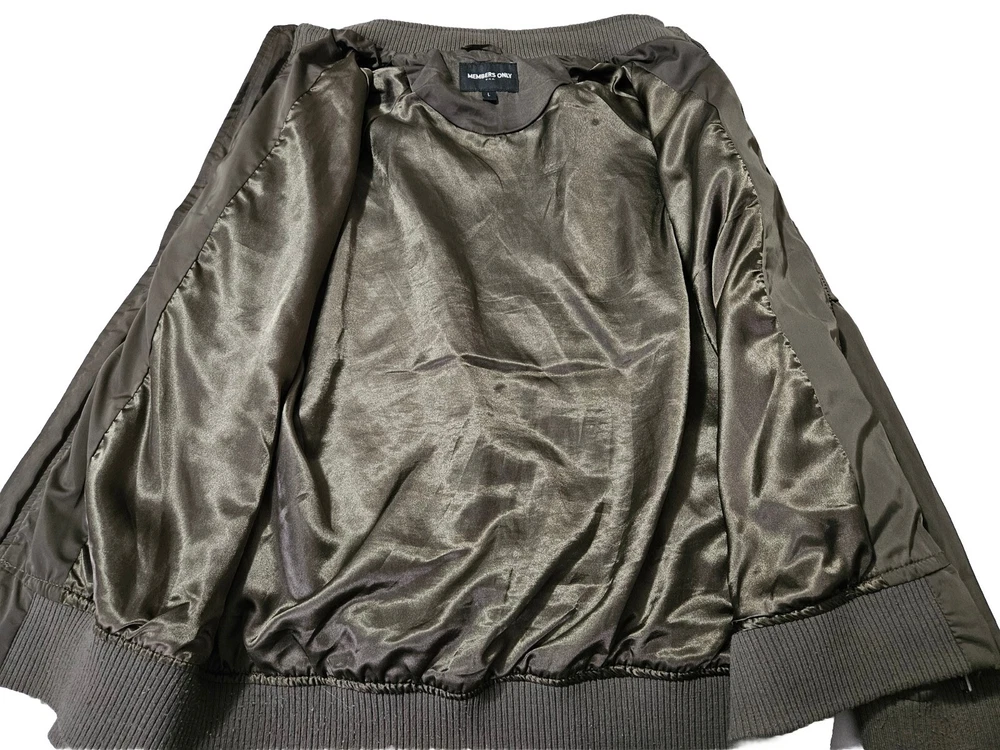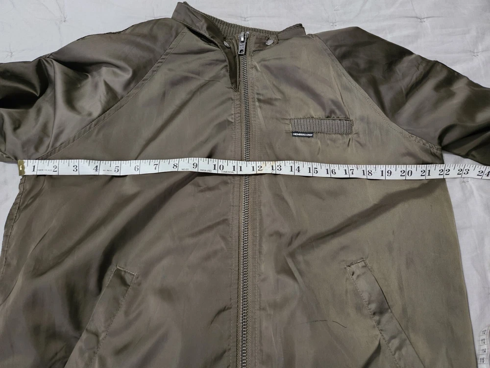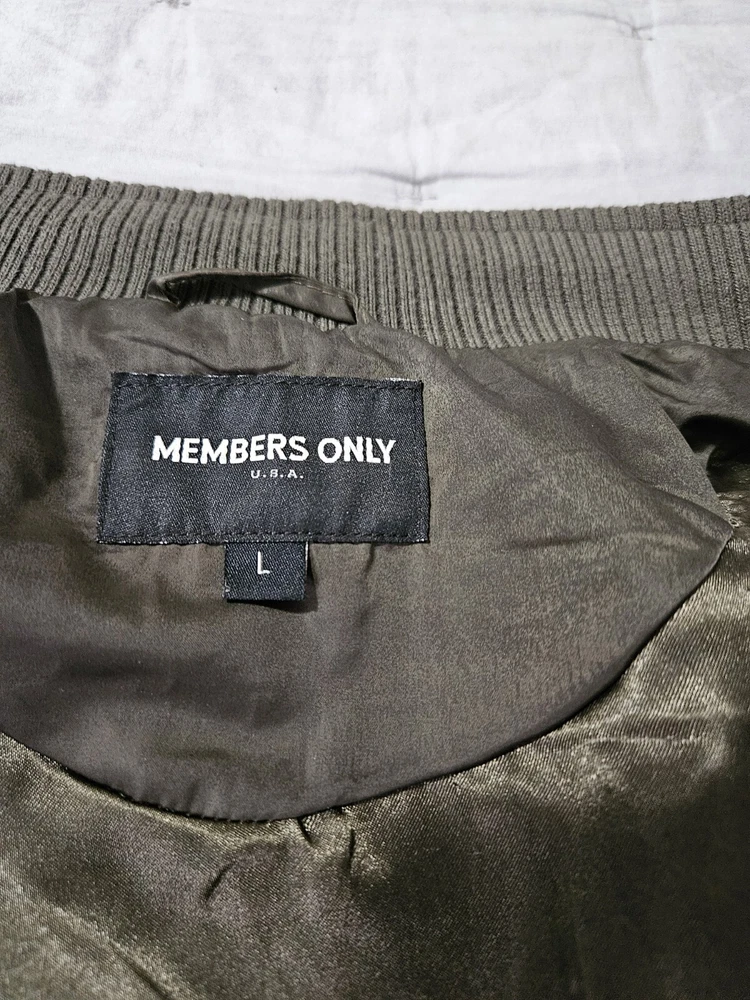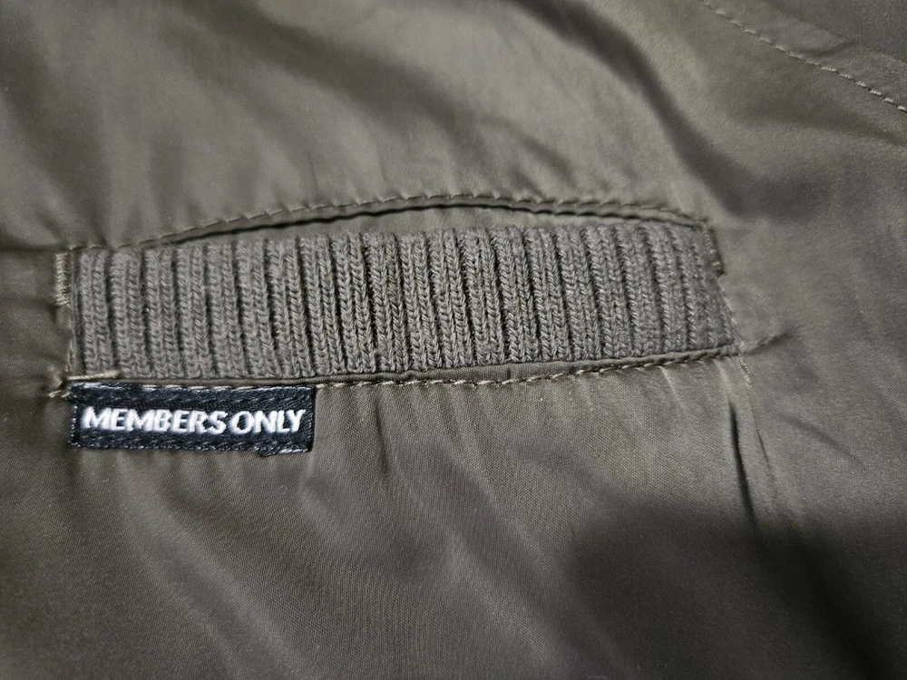This Members Only jacket in size L features a dark army green color and solid pattern, perfect for a vintage style. It has a bomber style with snap closure and zipper, suitable for all seasons. The outer shell material is made of polyester while the lining material is also polyester, making it comfortable to wear. This jacket is perfect for those who love army-themed clothing. It has features like lining and is pre-owned, making it a great addition to your collection. The jacket is from a well-known brand, Members Only, and is suitable for regular size. Some wear see pics.