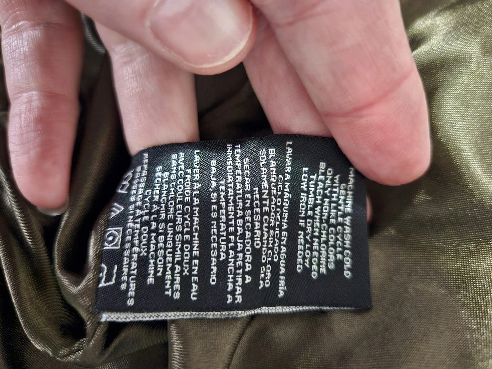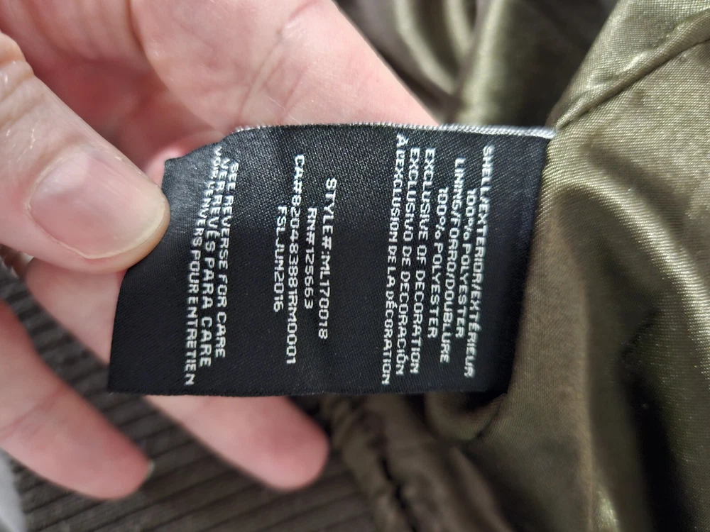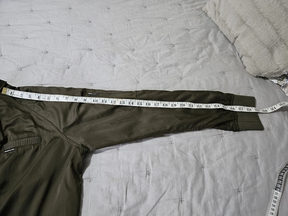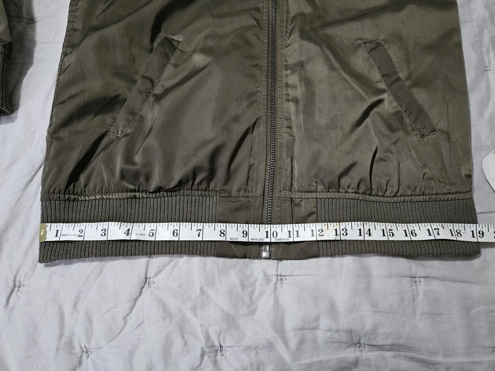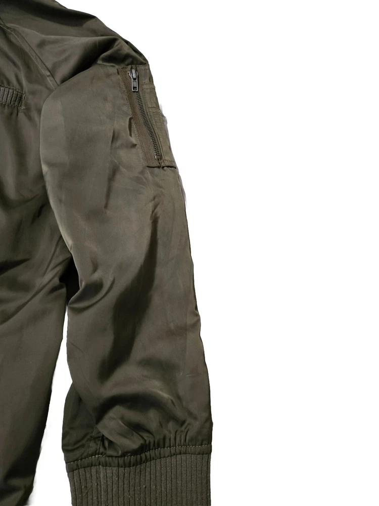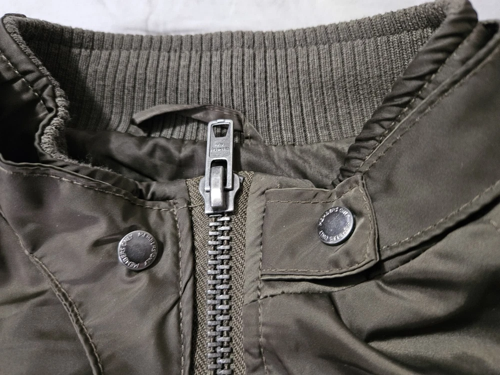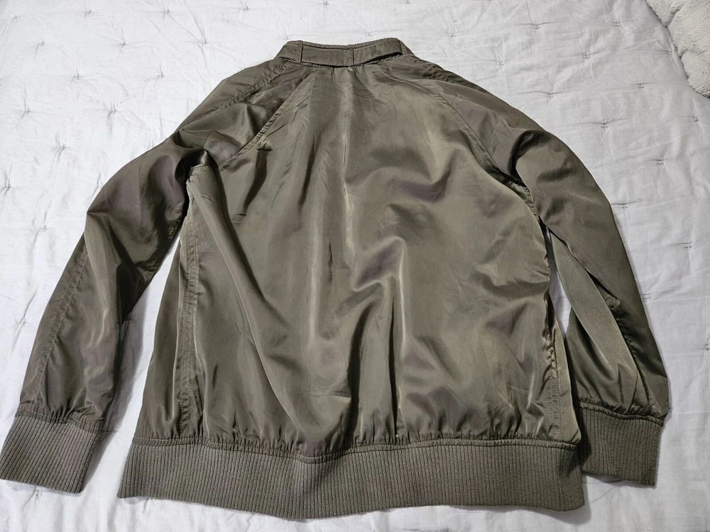 This Members Only jacket in size L features a dark army green color and solid pattern, perfect for a vintage style. It has a bomber style with snap closure and zipper, suitable for all seasons. The outer shell material is made of polyester while the lining material is also polyester, making it comfortable to wear. This jacket is perfect for those who love army-themed clothing. It has features like lining and is pre-owned, making it a great addition to your collection. The jacket is from a well-known brand, Members Only, and is suitable for regular size. Some wear see pics.