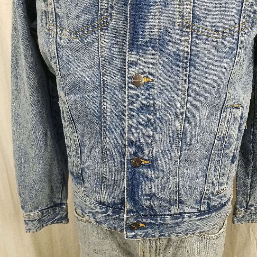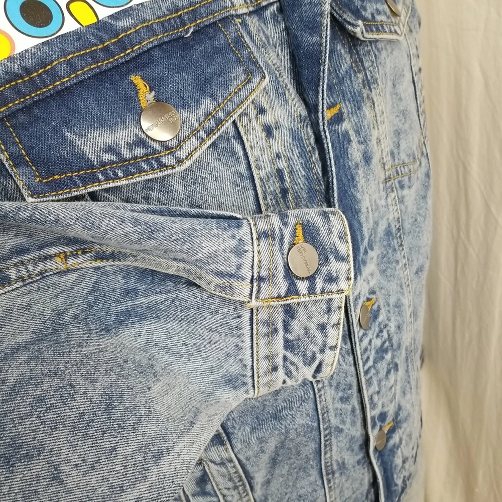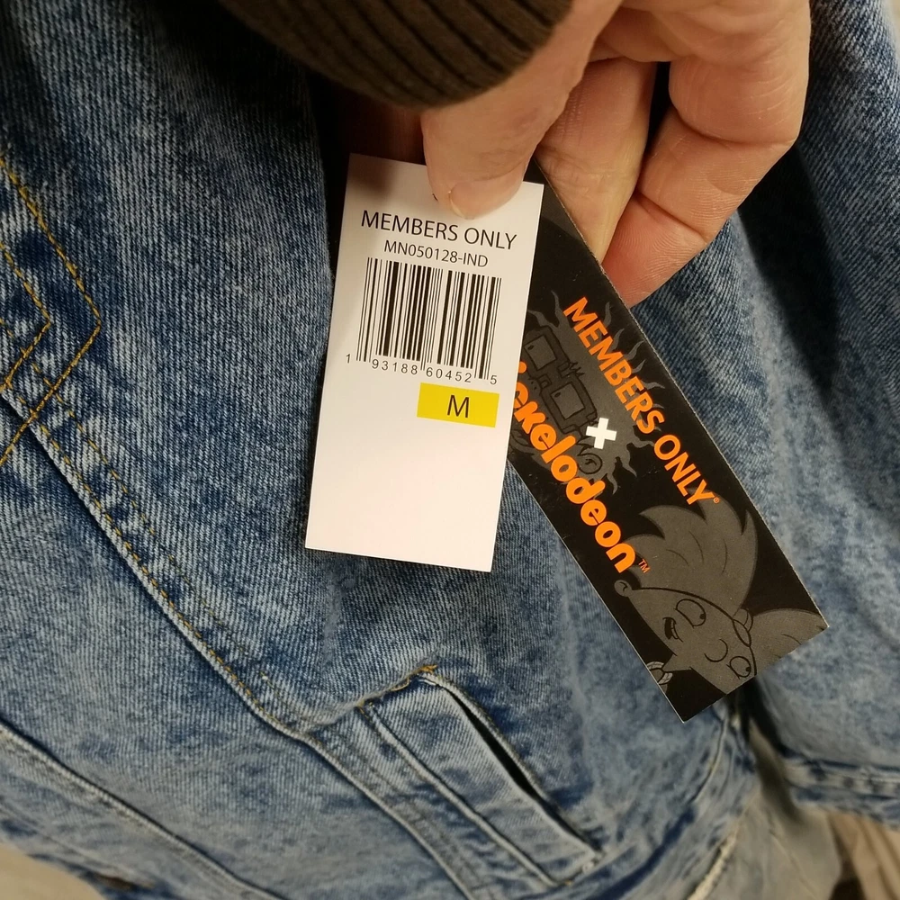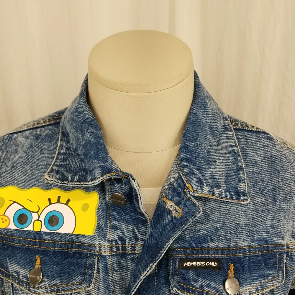 Members Only X Nickelodeon Classic SpongeBob Denim 4 Pocket Trucker Jean Jacket. This jacket is tagged a Medium. The actual measurements are shoulder to shoulder 17", pit to pit 22", shoulder seam to cuff end 25.5", collar seam to the bottom of the back hem 26.5". Please use these actual measurements to make any purchasing decision. Super nice, NWT jacket. Please see photos for a detailed description.