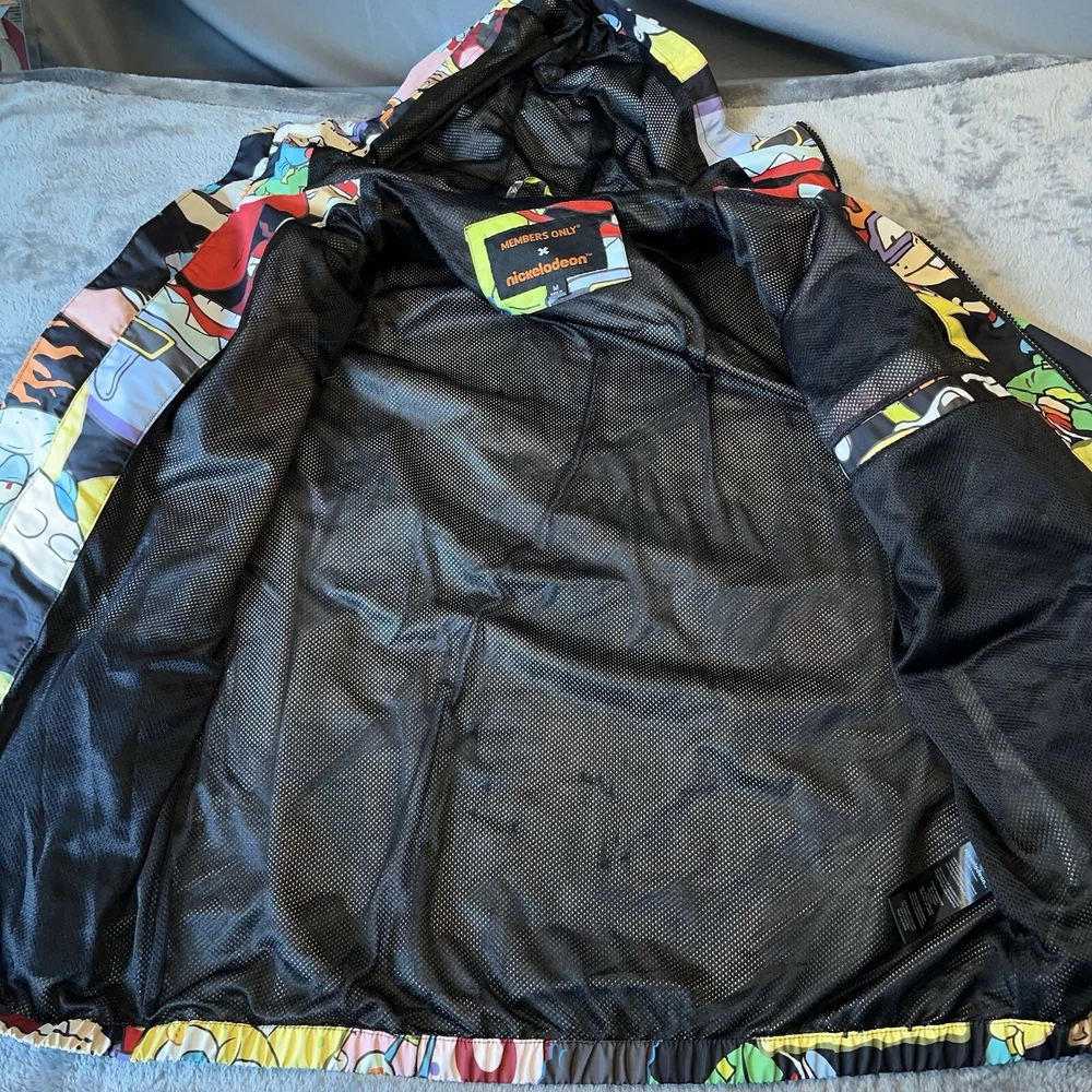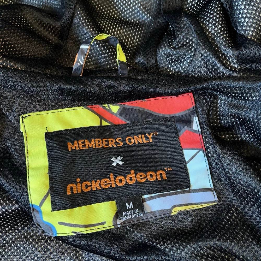 Members only x Nickelodeon jacket in men’s medium. In good preowned condition, there is some visible pulling on the inner lining shown in the photos. Please see photos for measurements and more.