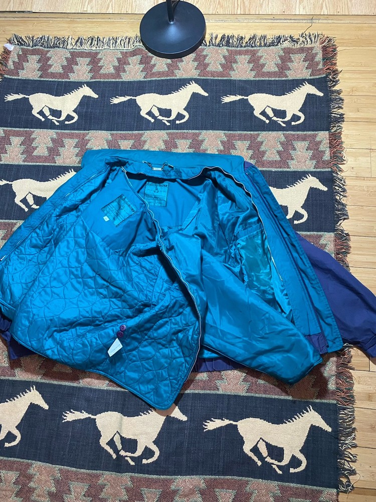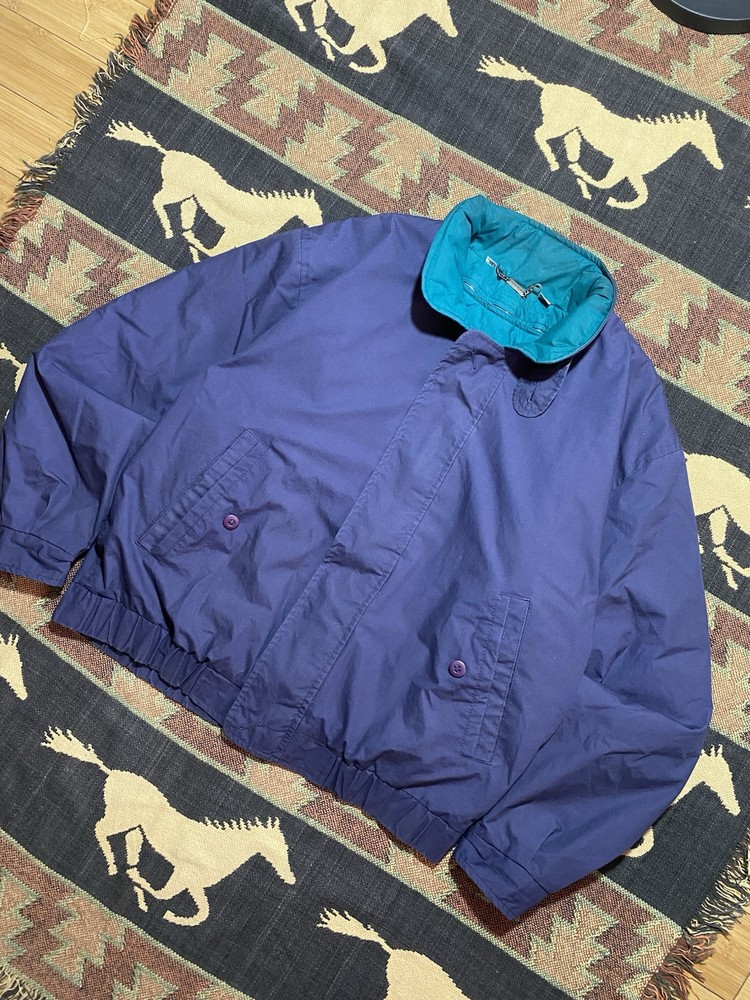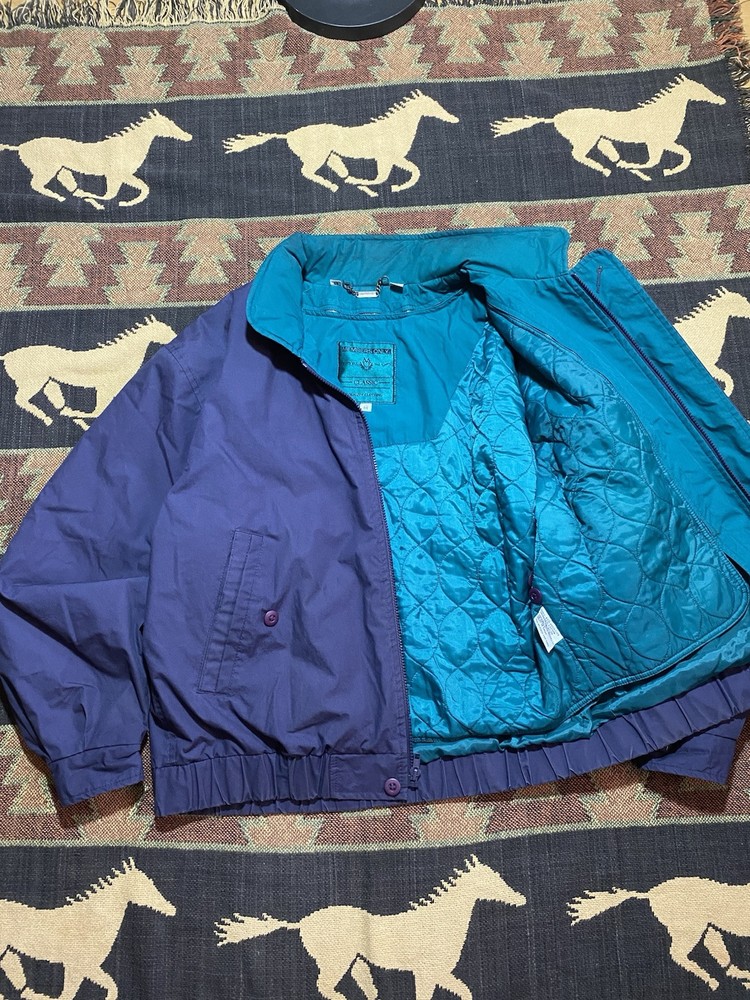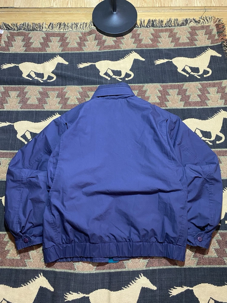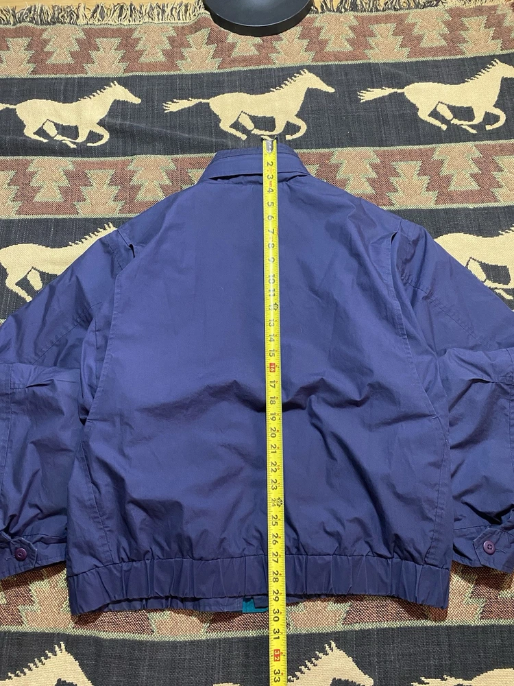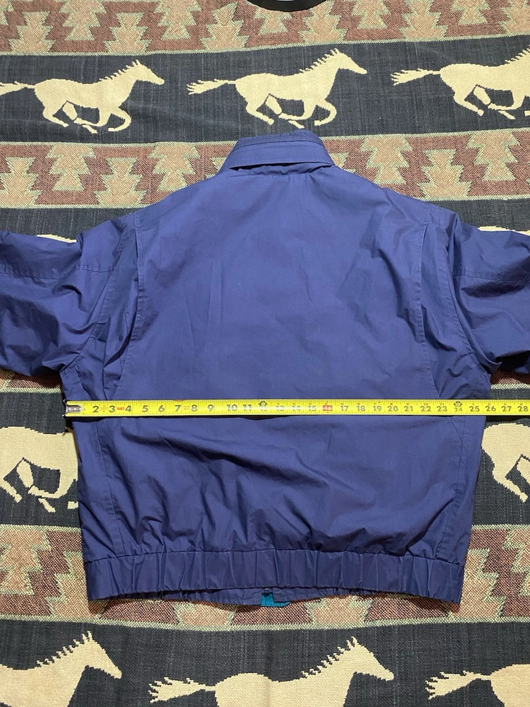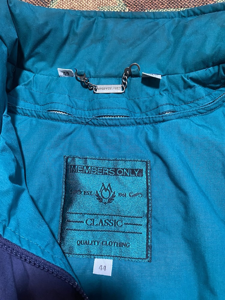 This is a vintage Members Only iconic racer jacket in size L, crafted from polyester with a nylon lining. The blue bomber jacket features a solid pattern, full zip closure, fleece fabric, and polyester insulation. It is designed for travel, casual, and workwear occasions, exuding a classic 90s style with zipper accents.
