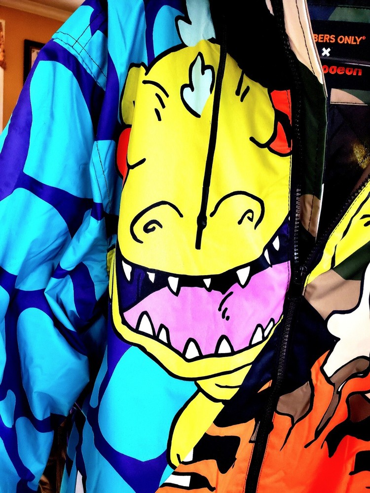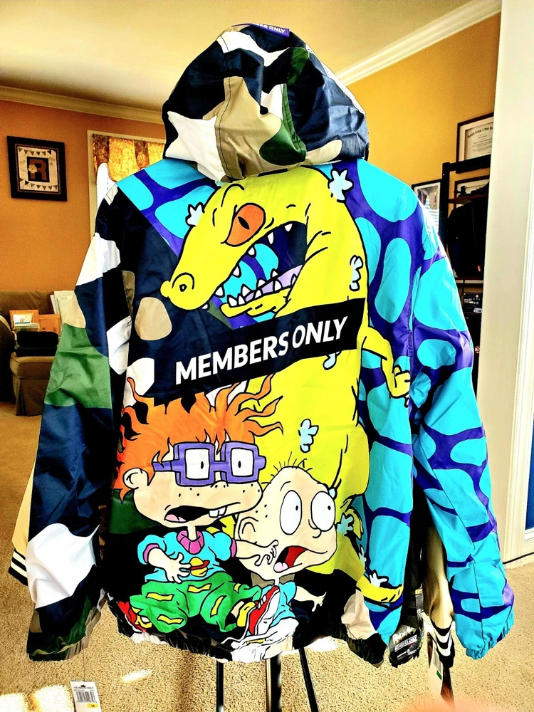 Members Only x Nickelodeon Rugrats windbreaker jacket is a versatile and stylish piece for any casual or travel occasion. The multicolor jacket features a camouflage pattern and is made of polyester material. It has a full zip closure and a band collar style. The jacket is perfect for walking, volleyball, skiing, and running & jogging in the winter, fall, and spring seasons. This mid-length jacket is handmade and has a regular fit. It is machine washable and has zipper accents. The Members Only x Nickelodeon Rugrats windbreaker jacket is a great addition to any wardrobe, perfect for fans of the iconic animated series.