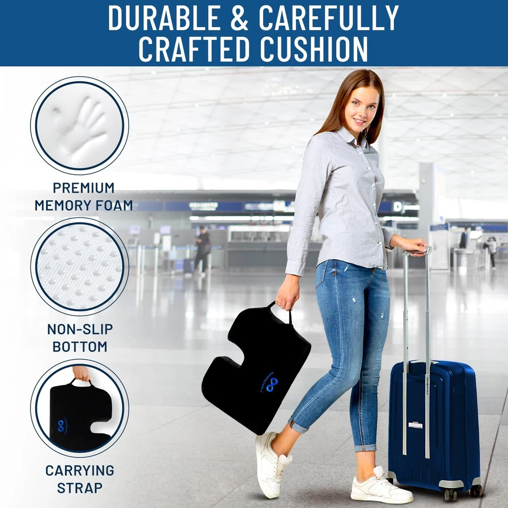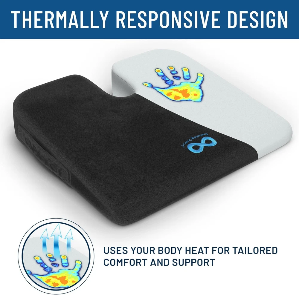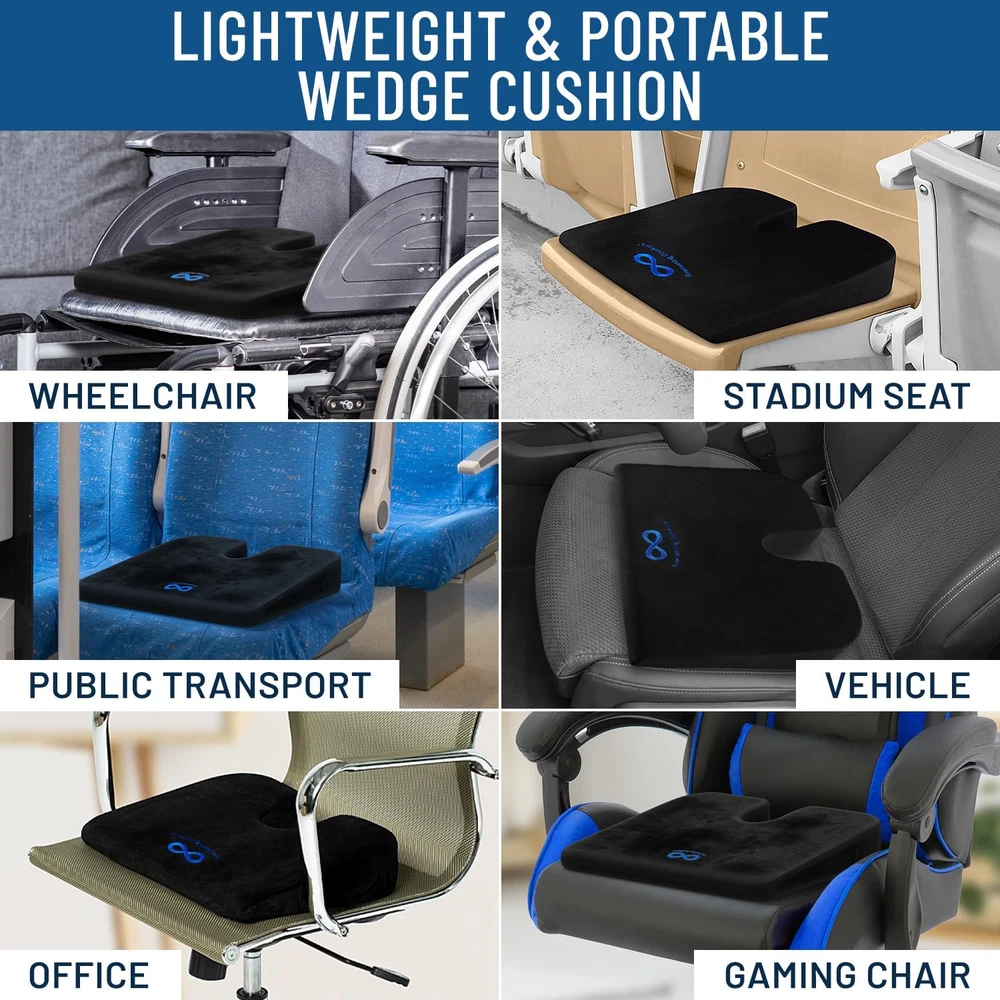 Ergonomic Car Seat Wedge Cushion: Featuring a U-shaped cutout, this truck seat cushion or car seat cushion supports your tailbone and reduces pressure, making long commutes and drives more comfortable; this car seat pillow is a road trip essential Premium Car Pillow for Driving Seat: Experience unparalleled comfort with our memory foam wedge seat cushion, designed to provide maximum support and elevate your driving experience Versatile Wedge Cushion for Chair: Use for cars, office chairs, and wheelchairs, our seat wedge cushion adds height and comfort. Our driver seat cushion for truck drivers and everyday commuters has the optimal amount of cushion for any long drive Durable and High-Quality Cushion: Made with premium materials, our wedge cushion is firm and sturdy, ensuring long-lasting use and reliable support Safe and Easy to Clean: Certified by OEKO-TEX and featuring a non-slip rubber bottom, our cushion stays in place and is safe for health. Machine washable for effortless maintenance Product Description Experience long-lasting comfort with the Everlasting Comfort Wedge Cushion. Lab tested, earning the STANDARD 100 label by OEKO-TEX, every component of our wedge cushion has been certified safe. It’s unique U-shaped design provides custom support when sitting. Using heat responsive technology our advanced thick slanted foam cushion adapts perfectly to the shape of your bottom, providing ideal support, yet retains its shape after each use. Our cushion is made from pure memory foam. Find comfort in any seat with the cushion’s soft exterior, non-slip gel rubber bottom, and portable size. The cushion even features a convenient carrying strap on its side. Great for cushioning hard surfaces such as office chairs, plastic or metal chairs, stadium seats, airline seats, and bleachers. Start living comfortably with the Everlasting Comfort Wedge Cushion.