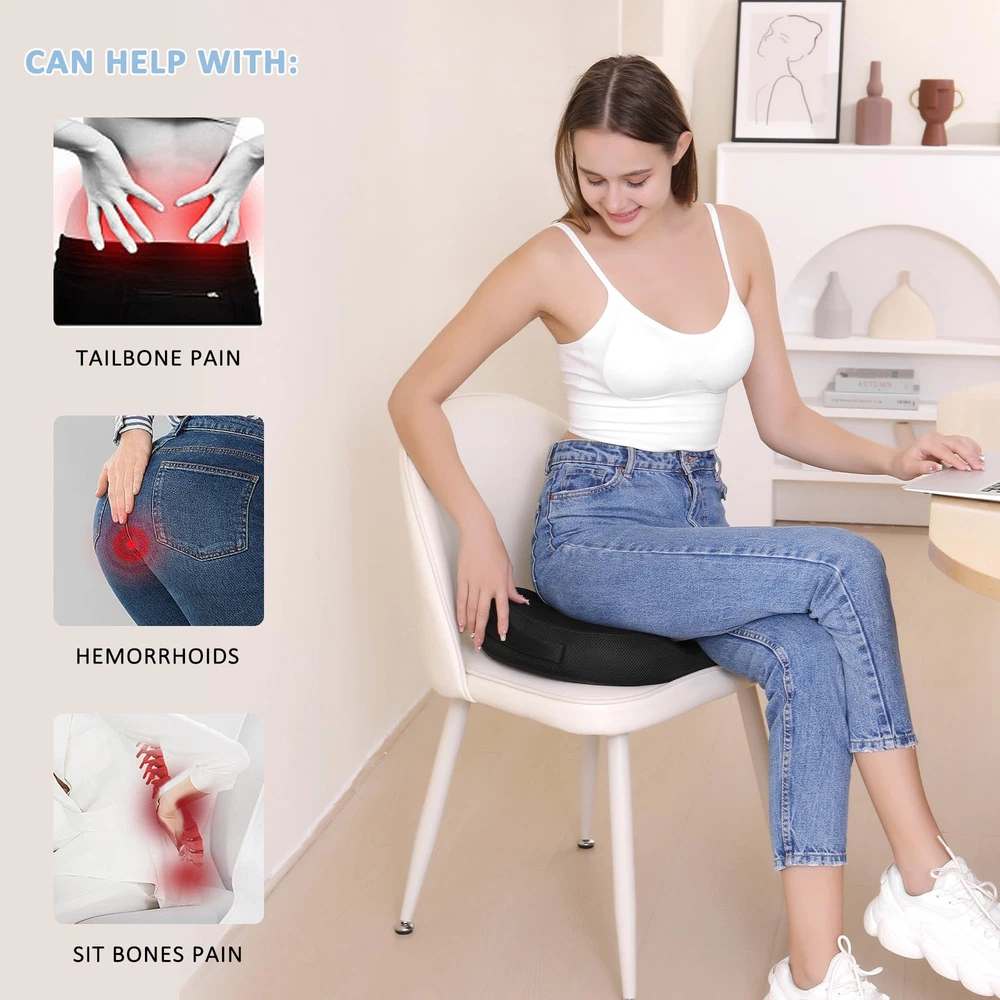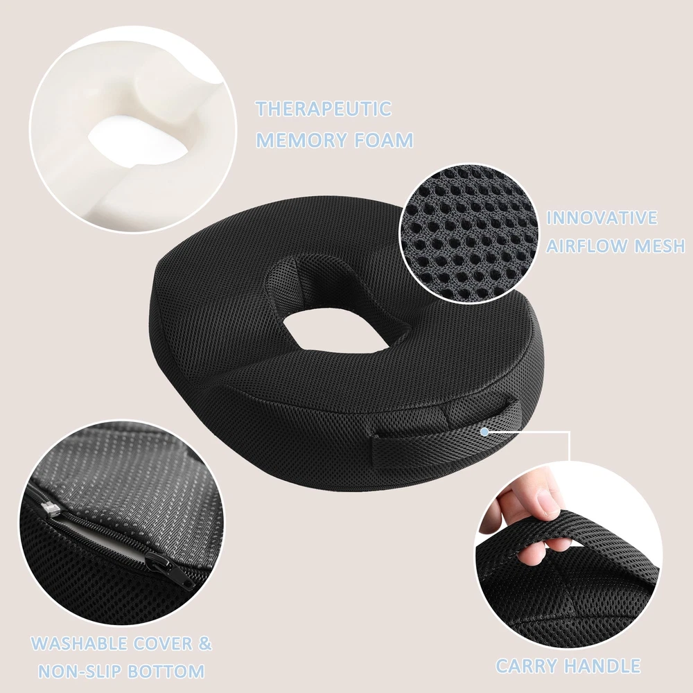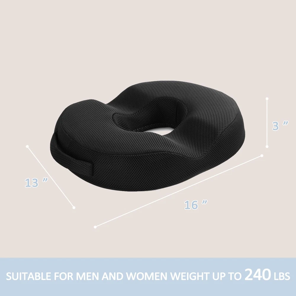 ERGONOMIC COMFORT BUTT DONUT: Relieve the pressure of hemmorhoid, pressure ulcers, prostatitis, postpartum, Tailbone pain, or bed sores, improves & supports proper posture. PREMIUM SITTING FEEL: High-density memory foam core with big hole &”U” shape, 3D airflow mesh cover brings your most sensitive areas dry and comfortable daylong, takes pressure off of the hemorrhoid, tailbone. UNIVERSAL USE: Portable with handle for use at home office or travel. Use as office chair cushion, car seat cushion, or wheelchair cushion. You can even take it on the plane, sitting comfort anywhere! This doughnut cushion measures 16x13x3 inches fits man and woman weight up to 240 lb. WASHABLE REMOVABLE COVER & NON-SLIP BOTTOM: Simply unzip the cover, remove it from the pillow and toss cover in the washing machine. High quality non-slip silicone spots on the bottom for non-slip, high performance use on hard and smooth surface. EVEN WEIGHT DISTRIBUTION: This sitting donut cushion is engineered with ComfortSupport foam to provide the balance you need between supporting you on the chair surface and the comfort to sit frustration-free.