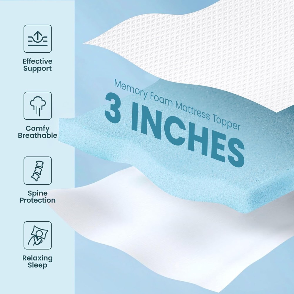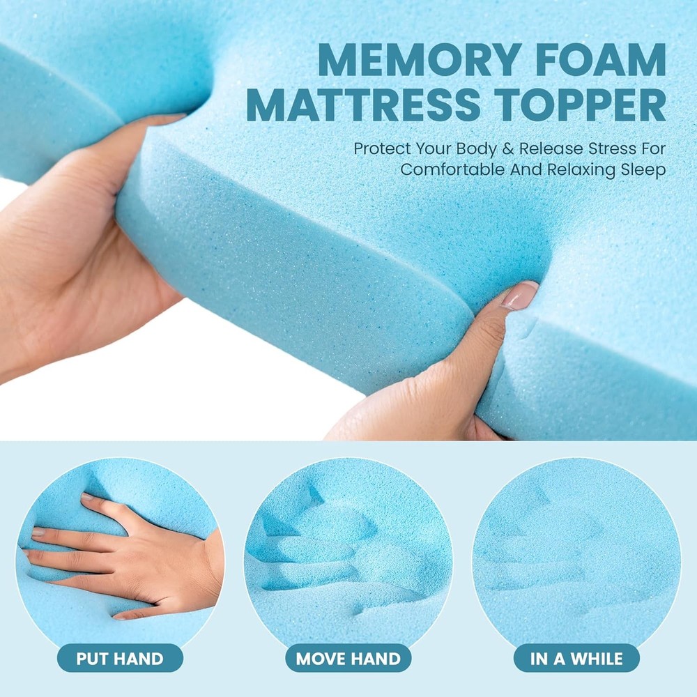 Memory Foam Mattress Topper Queen Size, AprLeaf 3 Inch Queen, Blue, White Product Details Brand: AprLeaf Color: Blue, White Size: Queen Fabric Type: Polyester Special Feature: Cooling Closure Type: Pull On Product Care Instructions: Machine Wash Water Resistance Level: Not Water Resistant Age Range (Description): Adult Material: Memory Foam Model Name: DM401-Q Number of Items: 1 Manufacturer: AprLeaf Item Firmness Description: Medium Firm Product Dimensions: 60 x 80 x 3 inches Item Weight: 20.9 pounds Item model number: DM401-Q ⭐️【Breathable & Removable Cover】Bamboo fiber makes the mattress topper cover more skin-friendly and breathable, not stuffy. The cover is removable and machine washable. The U-shaped zipper allows to easily remove the cover to keep it clean, promoting its longevity. ⭐️【Double non-slip design】 Non-slip surface on the bottom of the mattress topper increases friction and prevents movement. Four adjustable elastic straps hold the topper more securely to the mattress. The double non-slip design provides double the stability, ensuring that the mattress topper won't shift when you wake up ⭐️【Introduction of Use】 The Mattress Topper is packed vacuum for easy transportation. Before first use, it is recommended to allow 24-48 hours for the new foam smell to dissipate and fully expand to original size. Please do not leave the foam in the sun.