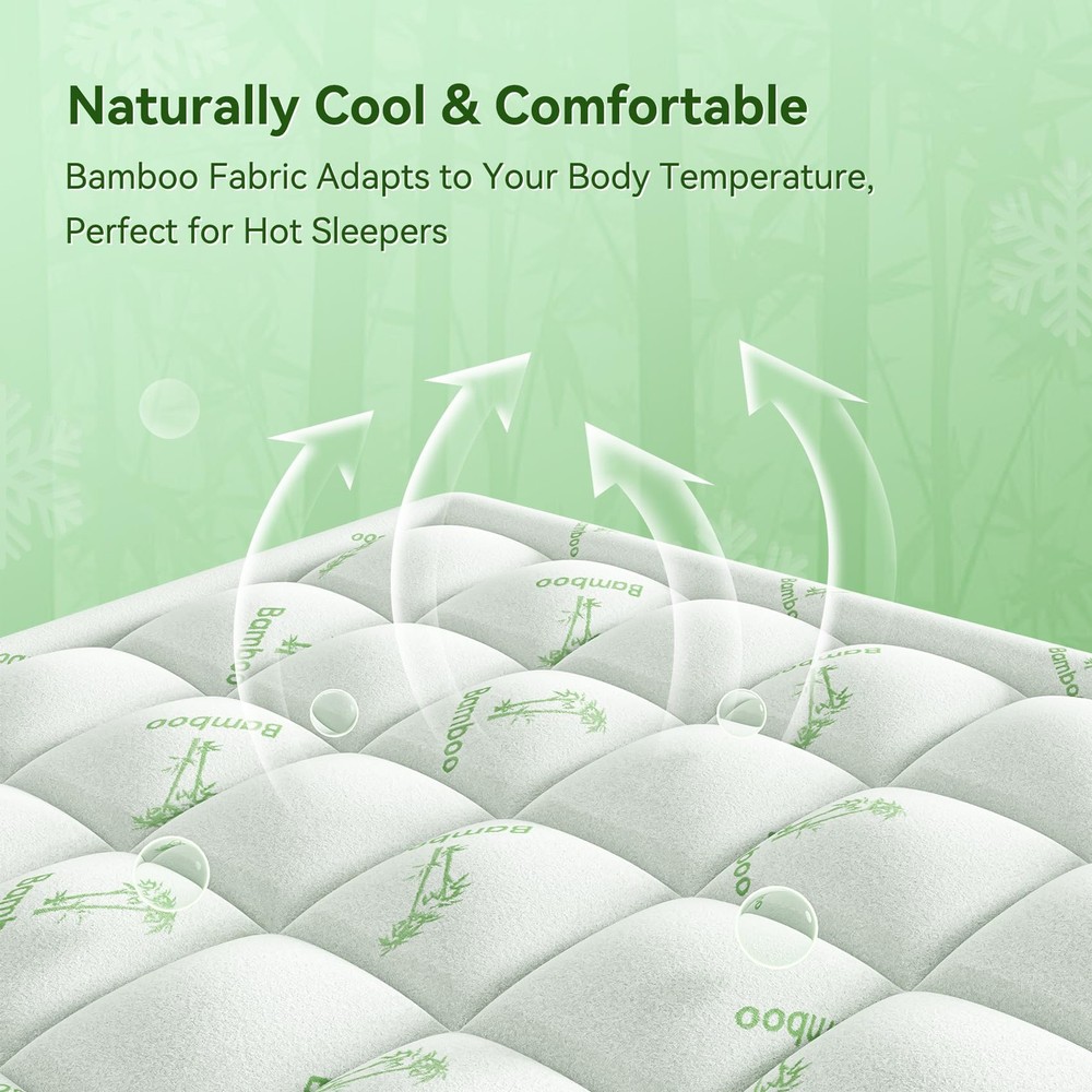 Cool & Breathable Queen Mattress Topper - Experience all-night comfort with our cooling mattress topper featuring a premium 40% rayon derived from bamboo + 60% polyester air-layer fabric. This cooling mattress topper queen size bed essential combines silk-like softness with 3D ventilation technology - perfect for hot sleepers and sensitive skin. Pressure-Relieving Pillow Top Support - Our shredded memory foam mattress topper queen design blends 50% adaptive memory foam with 50% hypoallergenic fiberfill. At 1200GSM density and extra-thick cushioning, this thick mattress topper queen provides optimal spinal alignment and back pain relief - making it the ultimate mattress topper for back pain relief. Deep-Pocket Secure Fit - The 360° elastic skirt effortlessly hugs mattresses 8"-21" thick. Works seamlessly as a mattress protector topper that stays firmly in place - no slipping, no bunching. Easy-Care Mattress Pad - This washable mattress pad queen size bed solution fits commercial machines! Simply machine wash cold, tumble dry low, and enjoy renewed fluffiness. Pro tip: Let air-fluff after unboxing for maximum loft. Oeko-Tex & Satisfaction Guarantee - Oeko-Tex certified mattress topper queen size bed essential. Love your cooling mattress topper or contact us hassle-free - we stand by every memory foam mattress topper with 100% support.