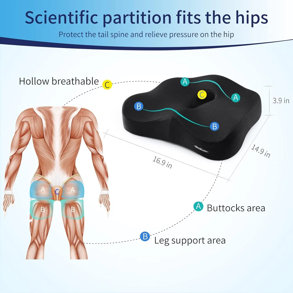 Store New Arrivals Add to Favorite View Feedback Contact Memory Foam Seat Chair Cushion for Relieves Back Sciatica Pain Tailbone Pain Coccyx Degenerating Disc Orthopedic Osteoarthritis Prostate Cushion Low Back Pain Cushion Hip Shaping (Black Mesh) Description Unit Count 1 Count Color Black Mesh Pattern Solid Product Dimensions 16.9"L x 14.9"W Material Memory Foam Country of Origin China Fabric Type Memory Foam Item Weight 2.01 pounds Shape Semicircular Fill Material Memory Foam Age Range (Description) Adult Number of Pieces 1 Special Feature Washable Product Care Instructions Machine Wash ✔️[Memory Form Seat Cushion]---Designed with the highest quality fabric that snugly fits over the foam cushion and is easily removed for cleaning. With an enhanced memory foam formula, the wedge/ U-shaped cut out ergonomic design cushion will contour to the body's pressure points to promote blood flow, help alleviate pain and provide the best comfort and support. ✔️[Obvious effect]---Our Coccyx Seat Cushion has proven to restore your spine's natural lumbar curve to the correct posture. You will feel instant relief from lower back pain, numbness and pain from sciatica, herniated discs, tailbone injuries, back pain from pregnancy, hip pain, hemorrhoids, and pressure sores. ✔️[Optimal material]---The Max&Love Memory Foam Wedge Cushion is crafted with the highest quality materials designed to provide you comfort and value, distributing your body weight across the seat, reducing pressure on your lower back and coccyx, while promoting proper posture and spinal alignment. ✔️[Widely practical]---Anti-slip design. What about placing it on the floor for Yoga, meditation? You will find it a perfect solution for kitchen chair, living room chair, couch, recliner, office chair,car seat, airplane, wheelchair. Provides a welcome relief for housewife, pregnancy,office workers,truck drivers and frequent travelers. Combine this cushion and proper movement throughout your day is the best way to keep healthy. ✔️[Best Gift and Satisfaction Guarantee] - Coccyx Seat Cushion is a perfect gift for parent, office staffs, drivers, students and teachers who sit for a long time. Risk-Free Purchase -30 days hassle free return policy,12 months product after-sales support ! Let your shopping more assured! [Memory Form Seat Cushion]---Designed with the highest quality fabric that snugly fits over the foam cushion and is easily removed for cleaning. With an enhanced memory foam formula, the wedge/ U-shaped cut out ergonomic design cushion will contour to the body's pressure points to promote blood flow, help alleviate pain and provide the best comfort and support. ABOUT US We offer the best prices around on high quality products. Our E-store includes media such as books, movies, music and games while offering electronics, toys, sporting apparel, clothing, tools, general home, garden items and more. SHIPPING We are always working hard to ensure your package arrives as soon as possible. Please understand that some factors like weather, high postal traffic, and the performance of shipping companies are outside of our control. We offer free shipping to the lower 48 states and ship within 2 business days of payment, usually sooner. We do not accept P.O. Boxes. Please provide a physical address. RETURNS We offer a 30-Day Return Policy on items which you are not completely satisfied with. You have the option for a full-refund or an exchange of the item. No returns are available on items shipped outside of the USA. PAYMENT We accept PayPal. CONTACT US This page content is yet to come Please ad us to your favorite seller and visit again later Thank You CUSTOMER SATISFACTION We try our very best to make sure every customer is completely satisfied. If there's a problem, message us! We're happy to help.