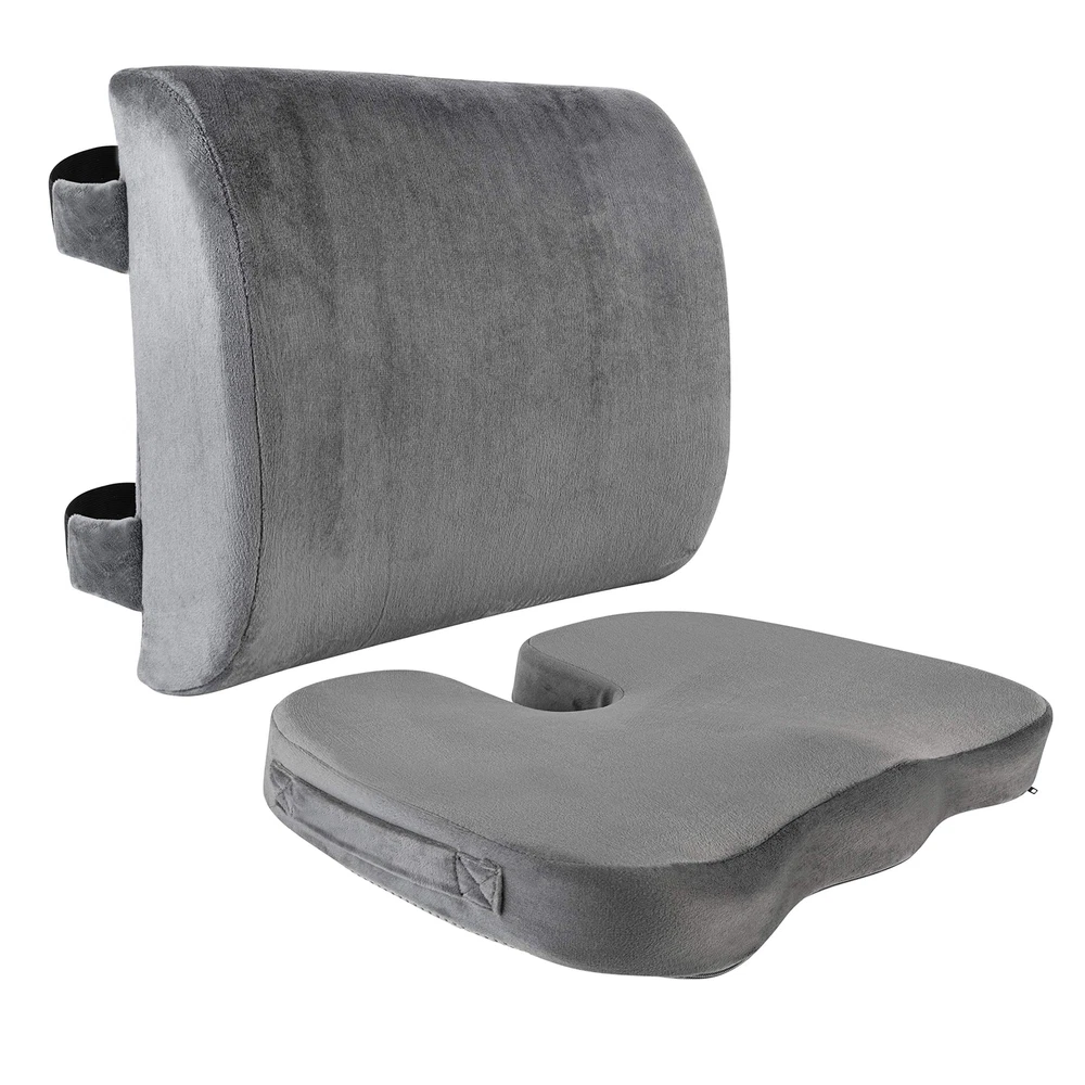 SET - Includes BOTH seat and back cushion. The Lumbar Back Cushion provides comfort and support and is made from contoured memory foam. The Memory Foam Seat Cushion is ergonomically designed to reduce pressure on the tailbone and coccyx while offering proper support and a comfortable seating surface. Coccyx cushion core is supportive memory foam offering support and proper immersion and pressure . Plush velvet cover offers a comfortable and cozy seating surface. A non-slip bottom ensures the cushion stays firmly in place. Together the seat and back cushion provide hours of comfortable seating. Use as a car seat and back cushion, office chair cushion, wheelchair cushion, home or anywhere for comfortable seating. Perfect hemorrhoid pillow. Ideal for back pain, post surgery, pregnancy, prostate treatment, and butt pillow after surgery. Sciatica cushion. Use as a chair cushion for pressure . Super comfortable, it will become your favorite desk chair cushion set. 2 Piece Set - Includes both the memory foam seat and memory foam back cushions. Great Value, Greater Comfort. MEMORY FOAM - The object of a cushion is pressure .This memory foam provides optimal support and cushioning, making it the perfect cushion. Car seat cushion set, Truck seat cushion set. Office chair cushion set. Tailbone pain cushion - Lower back pain, sciatica, post surgery, and pregnancy. Also used as a hemorrhoid pillow. The Lumbar Cushion contours and promotes proper seating while relieving back pain . Includes 2 extender straps. Plush gray velvet cover offers a comfortable, cozy and stylish seating surface.Lumbar cushion includes top and bottom straps for stay in place positioning. Cover is removable and washable. LARGE SEAT CUSHION SIZE - approx. 18 x 14 x 3 inches. Portable and easy to use, convenient carry handle on seat cushion - Use the seat cushion in your car, office, wheelchair, home or anywhere for comfortable seating. Butt pillow after surgery. Seat cushion for truck driver, cushion for car driver.