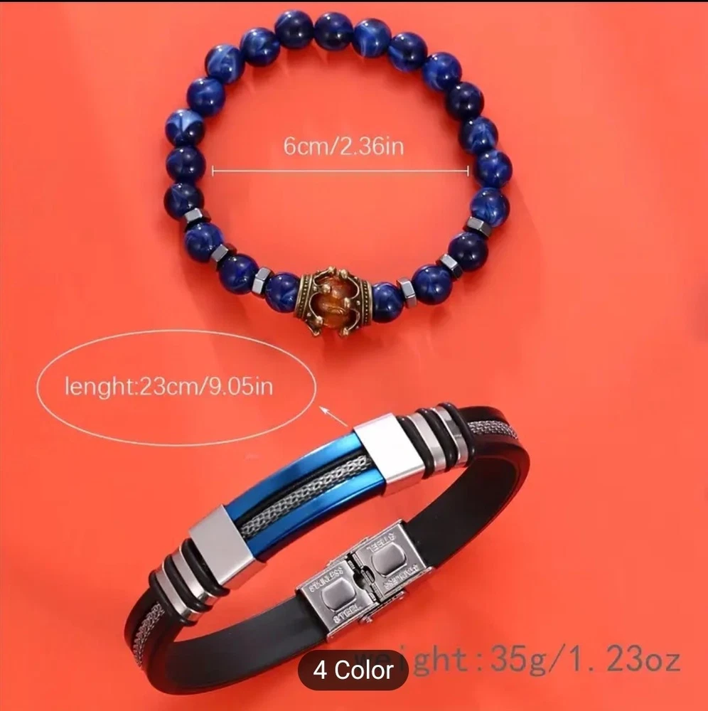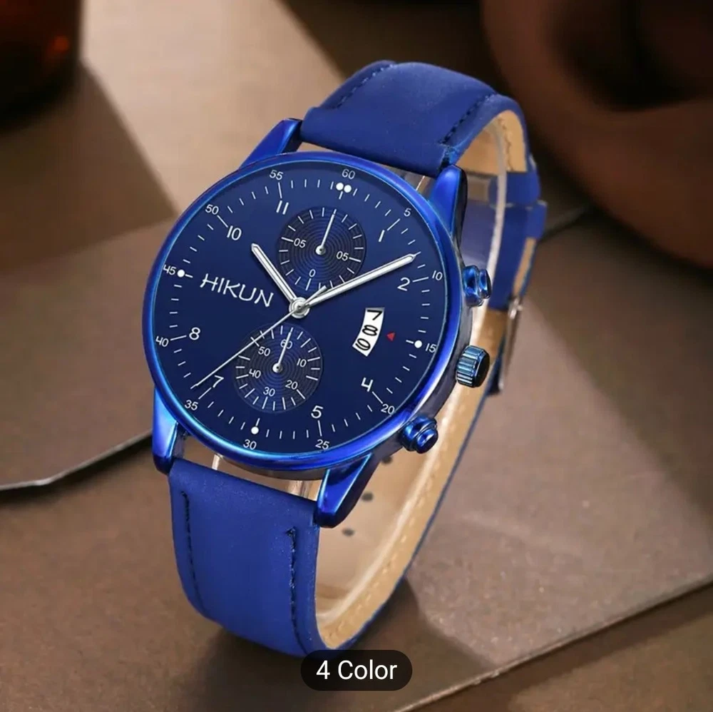 This is a new men's quartz wristwatch with a multicolor band made of stainless steel, leather, and metal. The watch features a blue case with a mineral crystal and luminous indexes. It has a self-winding movement and is water-resistant up to 10 meters. The dial displays Roman numerals, Arabic numerals, and square indexes. The watch comes with its original box and buckle closure.