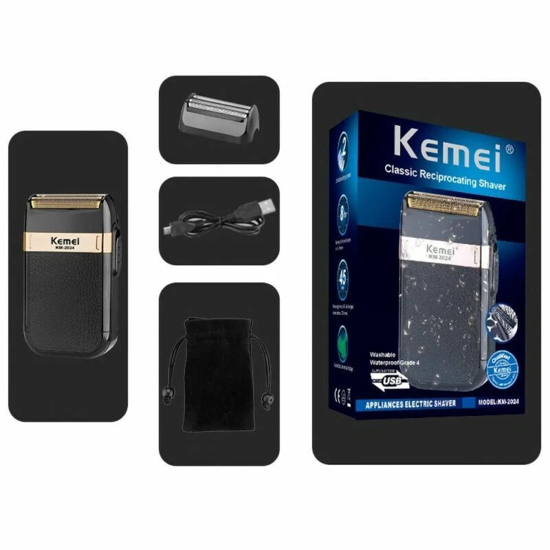 Product Description Feature 100% brand new and high quality Brand Name: KEMEI Model: KM-2024 Power supply mode: USB charging Cleaning method: Whole body washable Full Charge time: 8 hours Razor blade: Twin Reciprocating Blade Maximum power: 3W Weight: 289g Size: 120 X 60 X 30mm/4.72 X 2.36 X 1.18" Included: 1 X Shaver 1 X Gold Mesh Blade 1 X Silver Mesh Blade 1 X USB Charging Cable