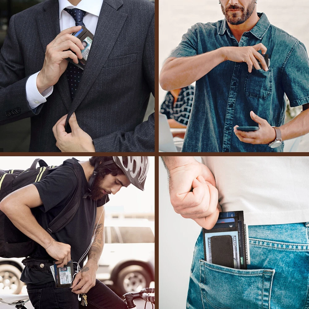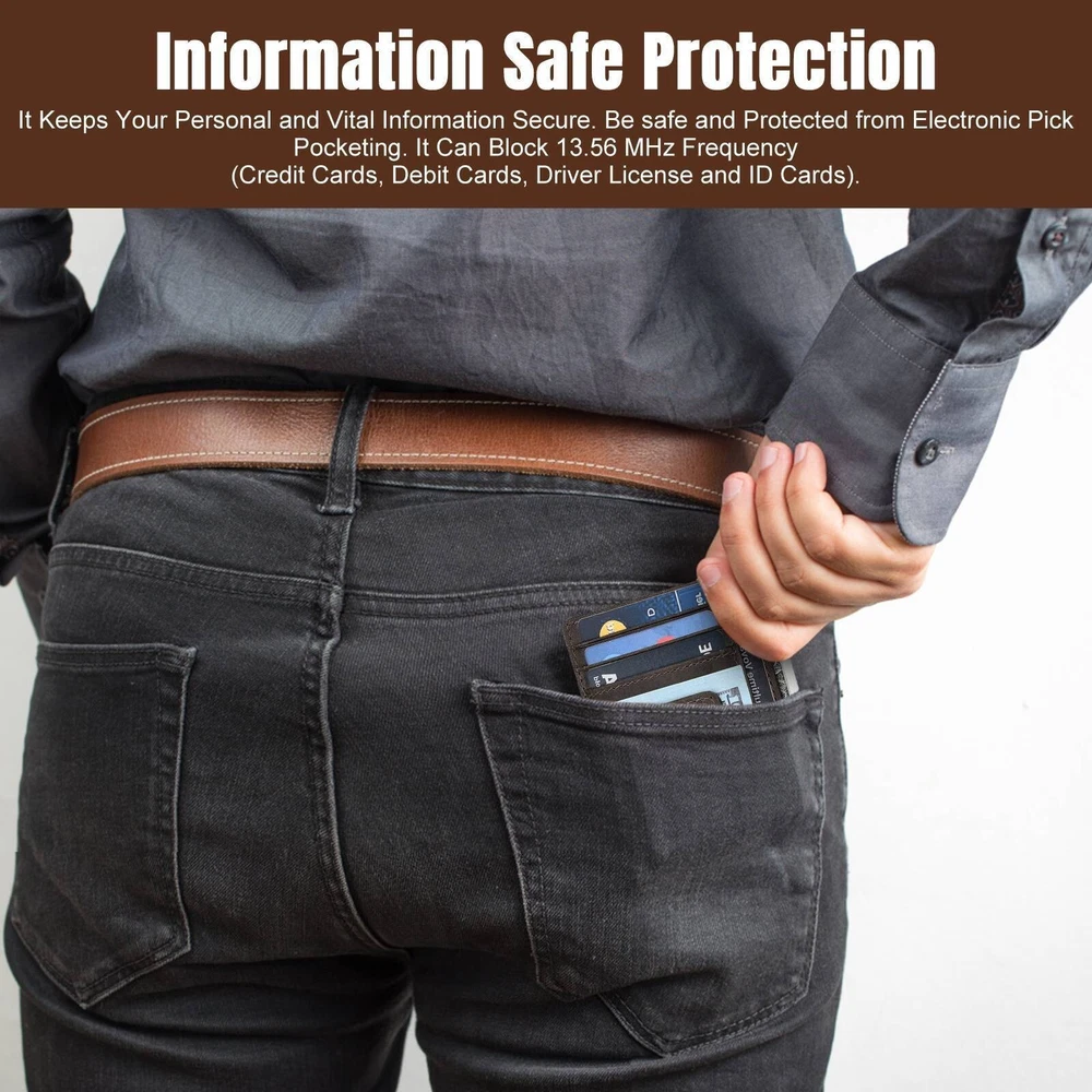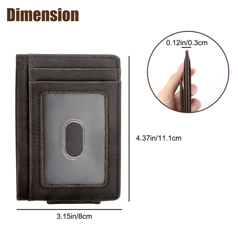 Product Feature π Genuine Leather : High-quality genuine full grain crazy horse leather with skilled line finish, wear-resistant, soft and durable. π Ultra Slim/Minimalist : It's size:11.1*8*0.3cm, ultra slim design, and is easy for carrying. Perfect fit in front pocket/back pocket, good choice to replace bulky wallet. π Powerful Magnetism : One powerful magnet is strong enough to hold plenty of cash and cards tightly. π RFID Blocking Protection : It keeps your personal and vital information secure. Be safe and protected from electronic pickpocketing. It can block 13.56 MHz frequency (credit cards, debit cards, driver's licenses, and id cards).