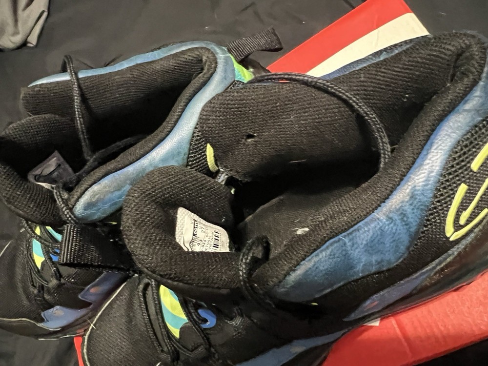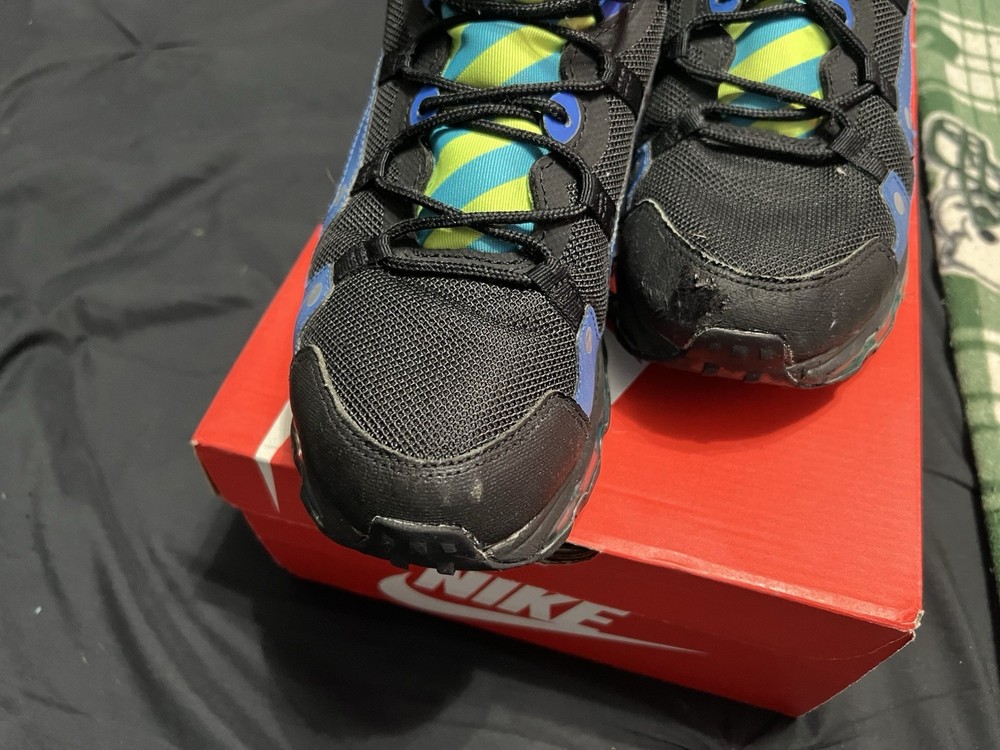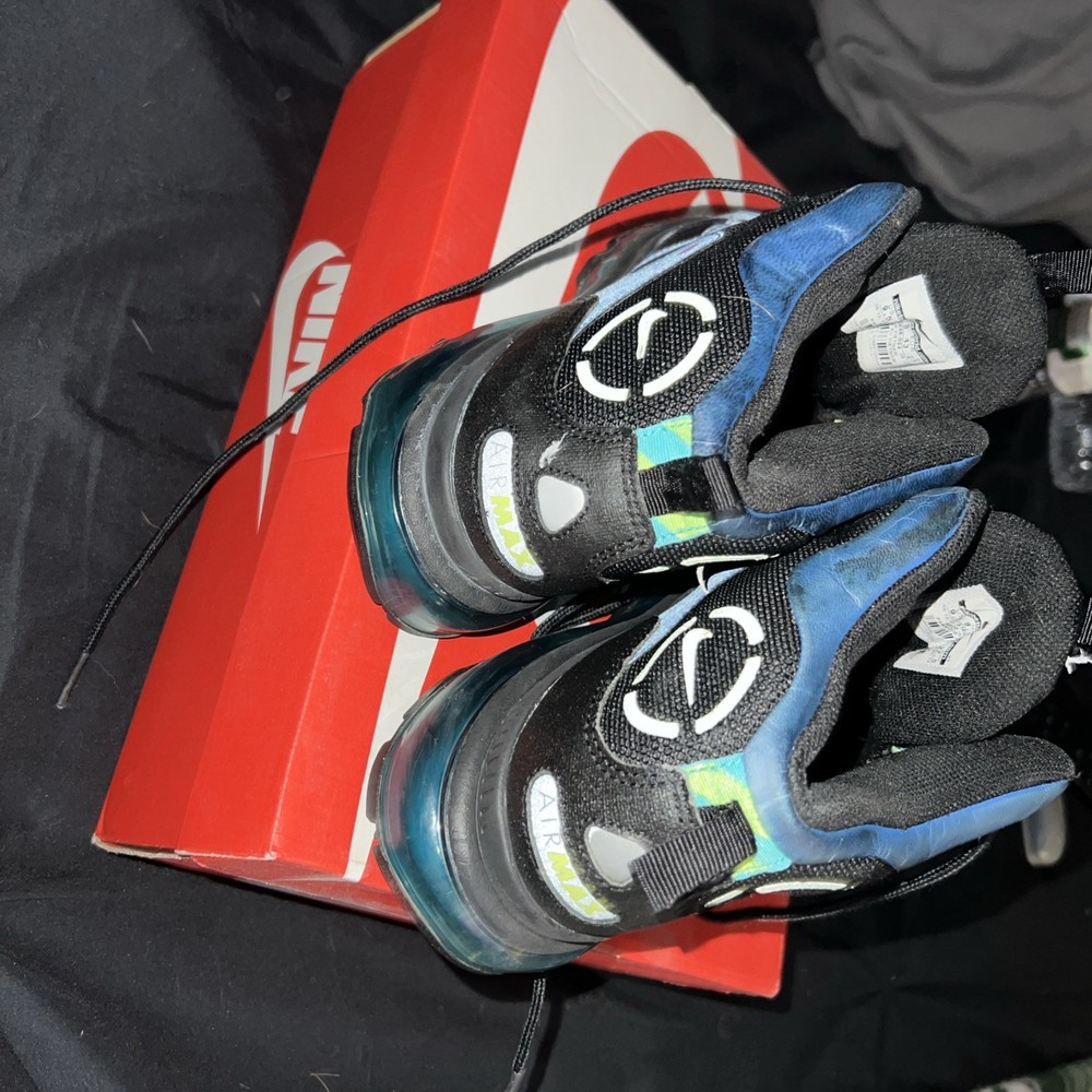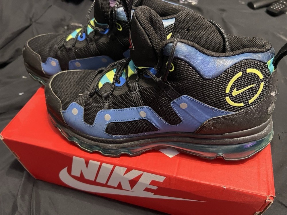 Blue black air max sneaker boots, excellent sole, small scuff on on the tips off both boots, some discoloration on the tops by the ankle.