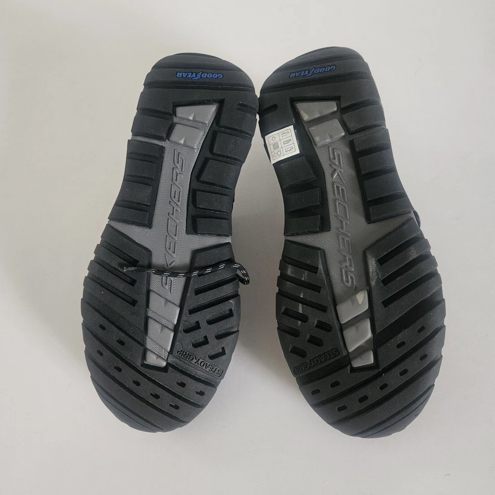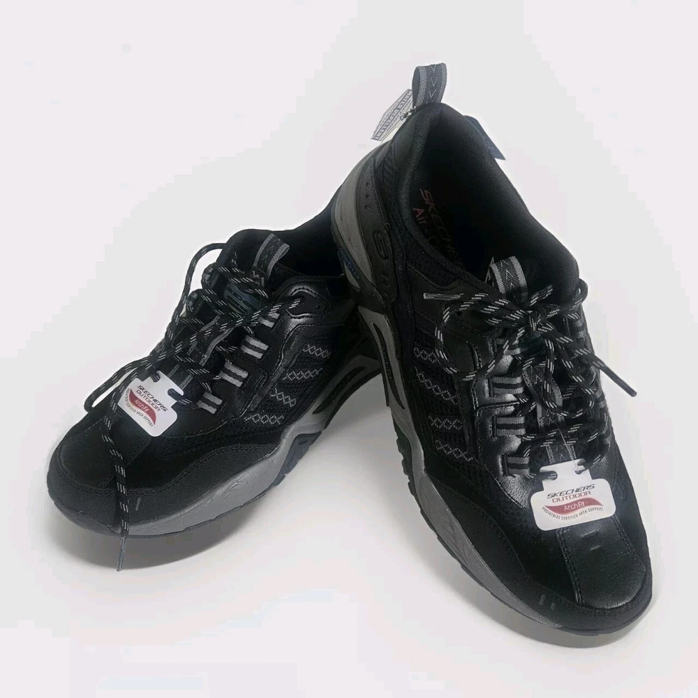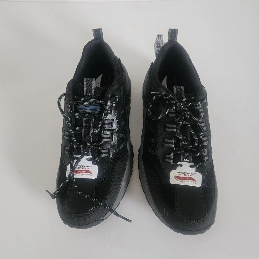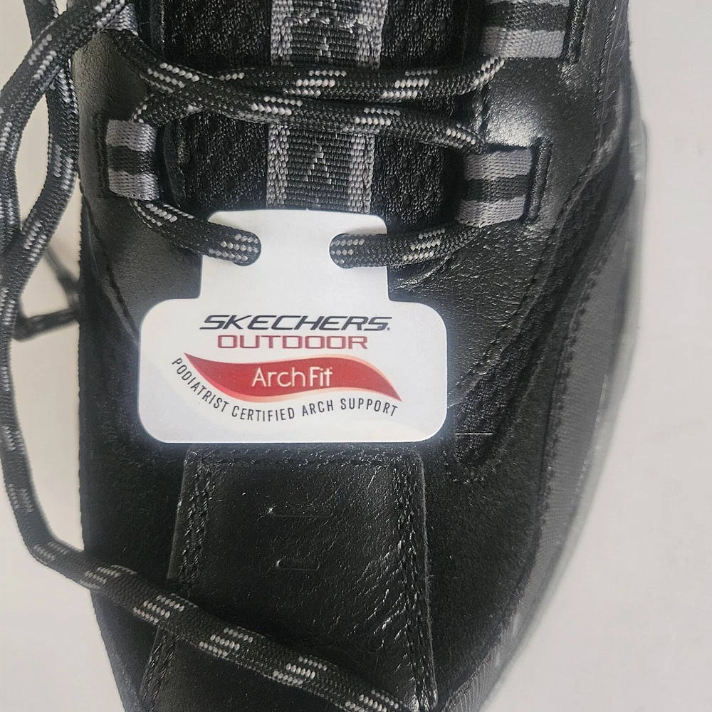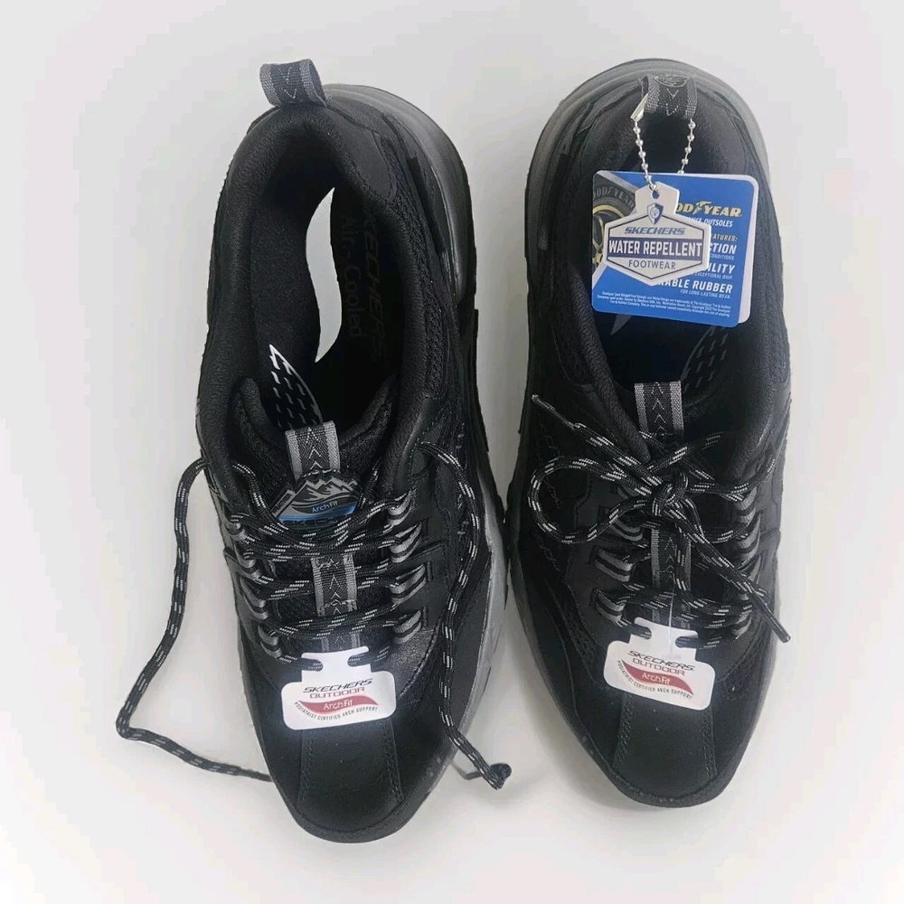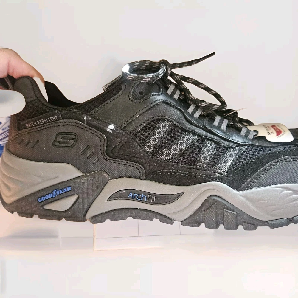 Men's Skechers Arch Fit Outdoor Shoes in Black, featuring a Good Year sole for durability and water repellent properties. These lace-up sneakers have a round toe shape and are designed for comfort with cushioning and breathability. Suitable for activewear or casual occasions, they are sized at US 11.5, UK 10.5, or EU 45.5. Made with leather upper material and a medium width, these Skechers are versatile for wearing in all seasons. They still have their stickers on but did not come in a box. Please check out my eBay store for more vintage treasures. I am always happy to combine shipping costs when possible. THANKS FOR STOPPING BY!