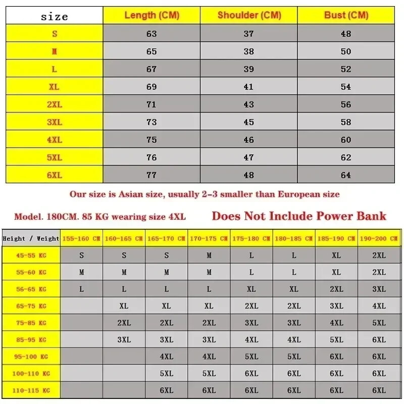 Press and hold the power button for three seconds then you can use it, please note that you need to use the power bank when you use it. Cloth Size We are Asian size, 2-3 sizes smaller than European size. Our Model:180CM / 85KG wearing size:Asian size 4XL Please choose the correct size according to our size chart and height/weight recommend. EU Size XS=Asian size M EU Size S = Asian Size L EU Size M = Asian Size XL EU Size L = Asian Size 2XL EU Size XL = Asian Size 3XL EU Size 2XL=Asian Size 4XL Please choose the right size according to your body shape